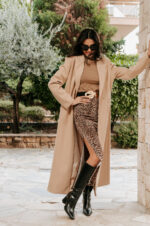 Παλτό μπεζ, με μακριά μανίκια και πέτο γιακά. Κλείνει μπροστά με κουμπιά. Διαθέτει διακοσμητικές τσέπες στο πλάι και εσωτερική φόδρα. Το μήκος φτάνει κάτω από το γόνατο. Για casual αλλά και πιο επίσημες εμφανίσεις.