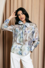 Πουκάμισο floral γαλάζιο. Διαθέτει στρογγυλή λαιμόκοψη που δένει μπροστά, μακριά μανίκια με μανσέτα και κουμπιά. Κλείνει με κουμπιά από πάνω μέχρι κάτω. Ένα πουκάμισο σιθρού, άνετο και εντυπωσιακό για βραδινές εμφανίσεις.