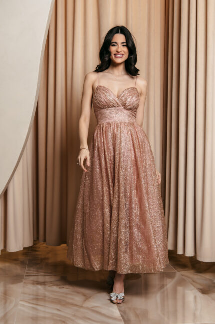 Φόρεμα midi rose gold με τρισδιάστατο γκλίτερ
