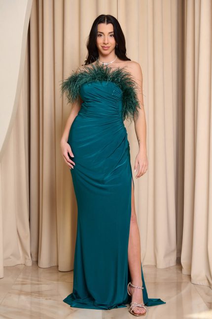 Φόρεμα maxi one shoulder με λεπτομέρεια feathers κυπαρισσί