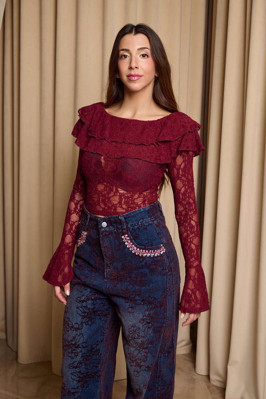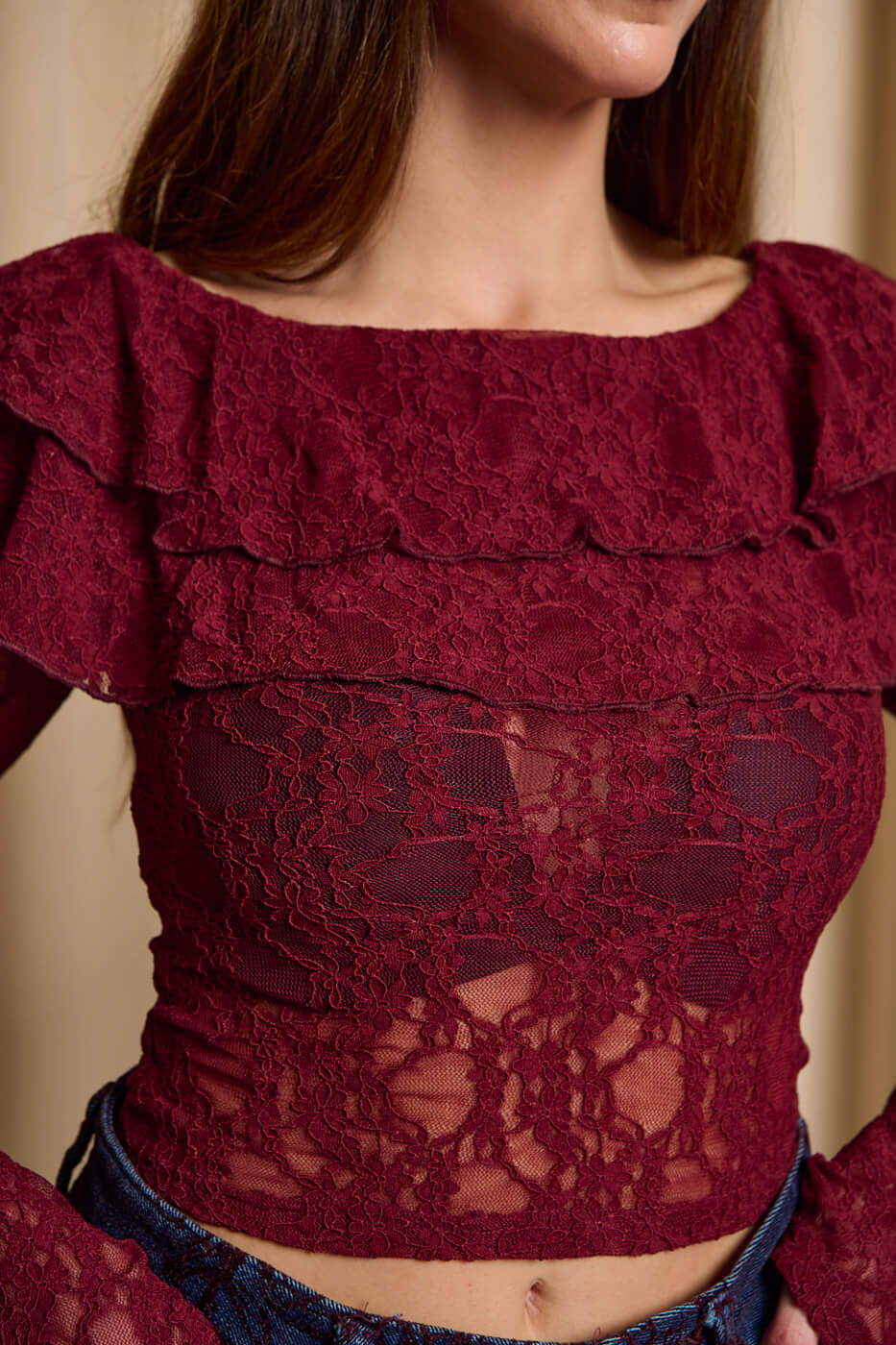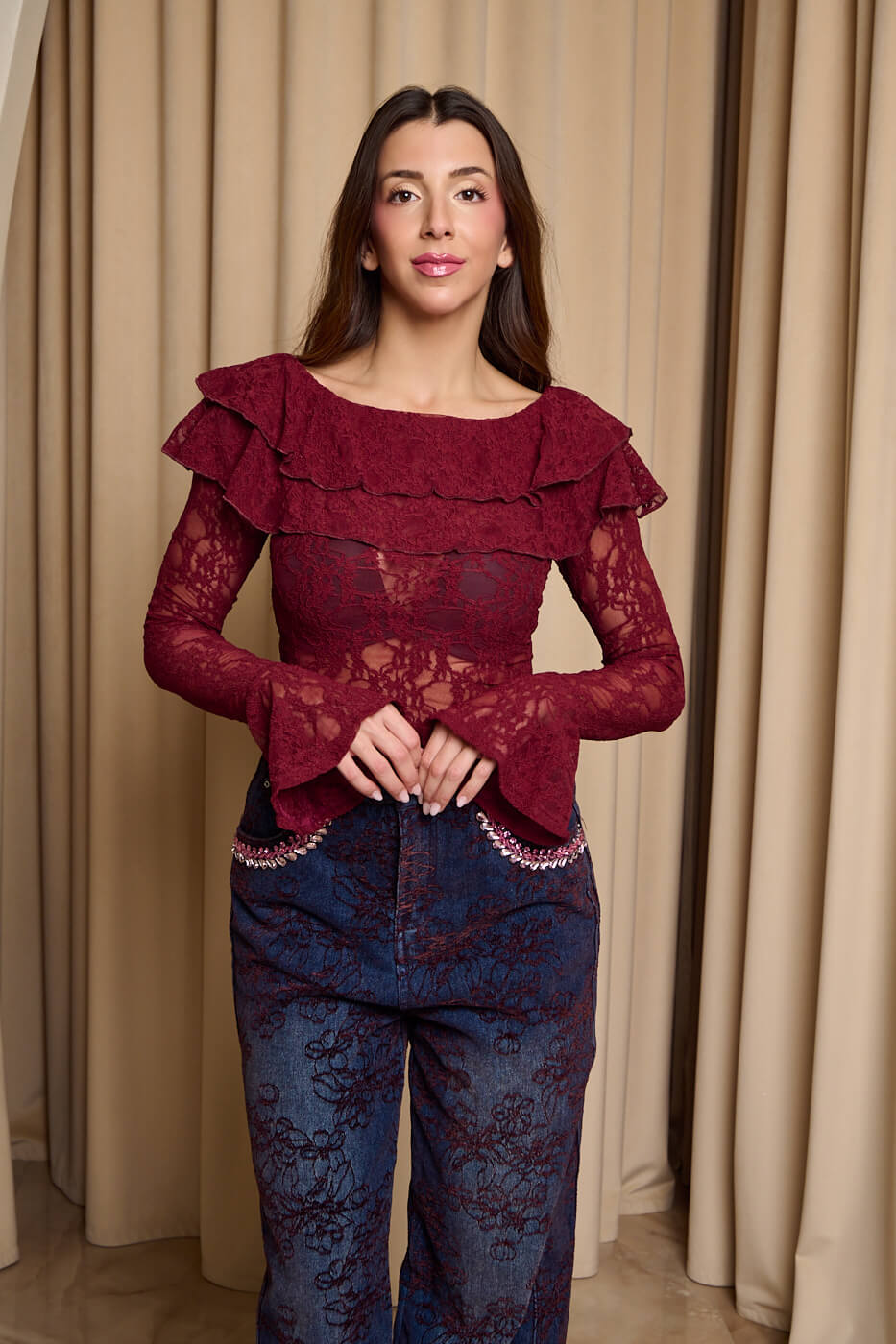 Μπλούζα με βολάν και δαντέλα βουργουνδί. Διαθέτει μπούστο χαμόγελο και δύο διαδοχικά βολάν στο πάνω μέρος. Μπορεί να φορεθεί και ως off shoulder καθώς διαθέτει λάστιχο. Τα μανίκια είναι δαντελένια με καμπάνα τελείωμα. Η δαντέλα δημιουργεί μια ελαφριά διαφάνεια χωρίς εσωτερική φόδρα