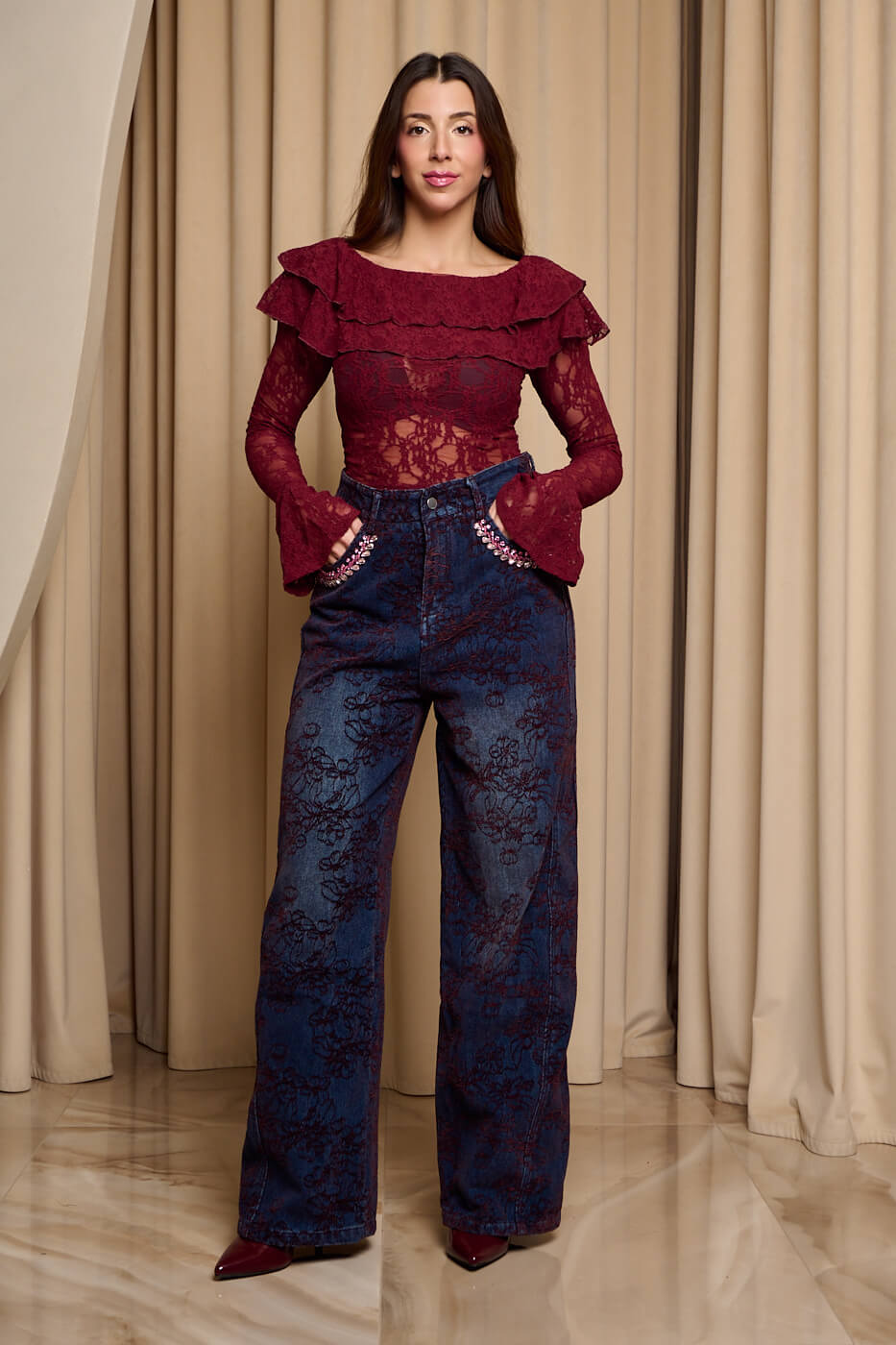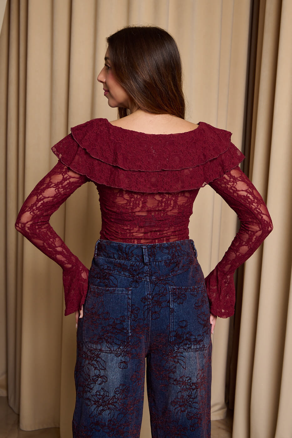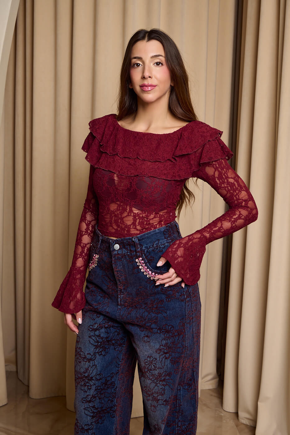 Μπλούζα με βολάν και δαντέλα βουργουνδί. Διαθέτει μπούστο χαμόγελο και δύο διαδοχικά βολάν στο πάνω μέρος. Μπορεί να φορεθεί και ως off shoulder καθώς διαθέτει λάστιχο. Τα μανίκια είναι δαντελένια με καμπάνα τελείωμα. Η δαντέλα δημιουργεί μια ελαφριά διαφάνεια χωρίς εσωτερική φόδρα