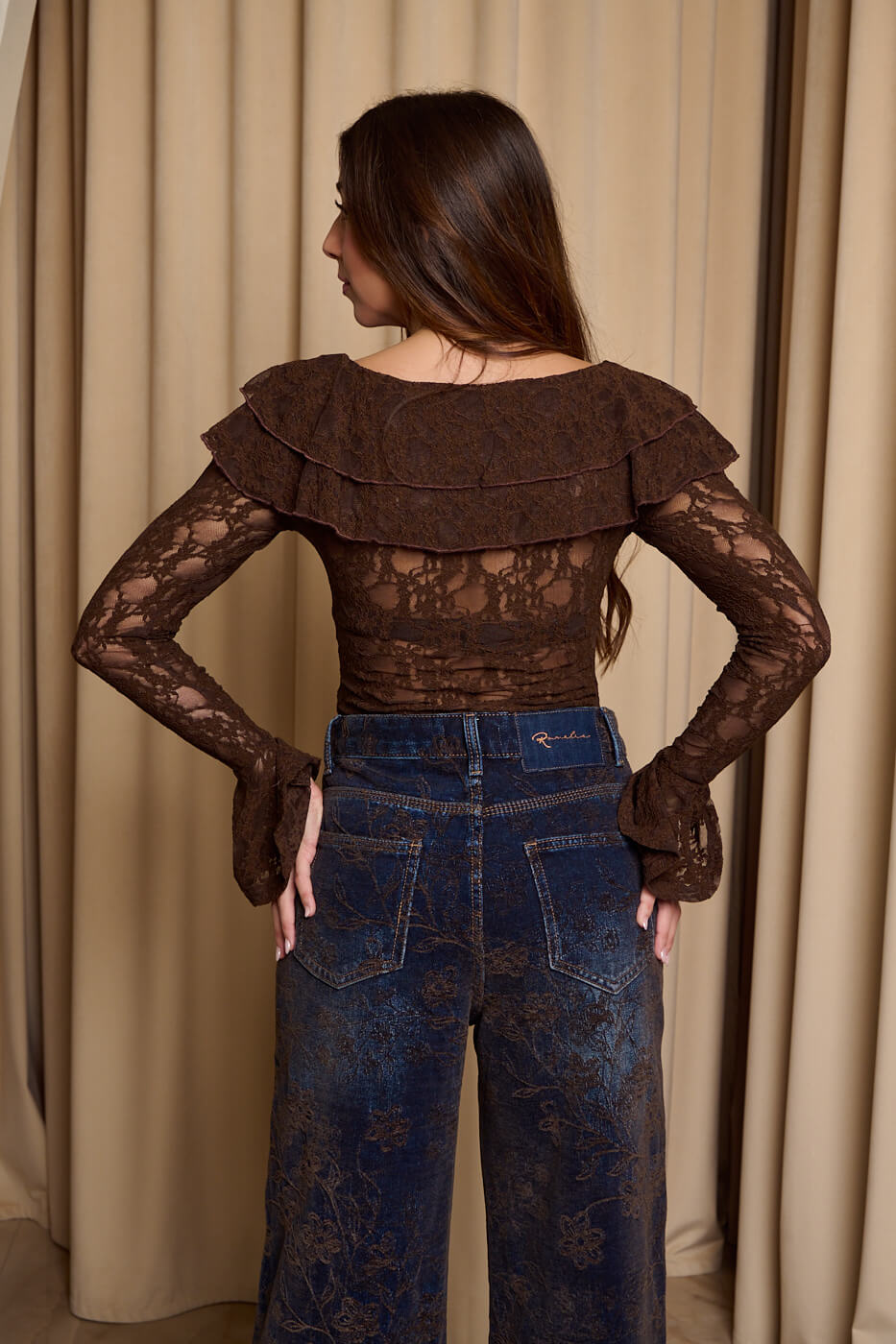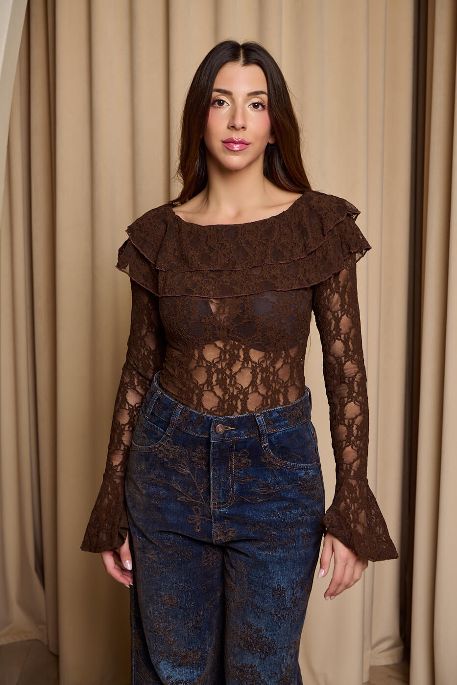 Μπλούζα με βολάν και δαντέλα καφέ. Διαθέτει μπούστο χαμόγελο και δύο διαδοχικά βολάν στο πάνω μέρος. Μπορεί να φορεθεί και ως off shoulder καθώς διαθέτει λάστιχο. Τα μανίκια είναι δαντελένια με καμπάνα τελείωμα. Η δαντέλα δημιουργεί μια ελαφριά διαφάνεια χωρίς εσωτερική φόδρα