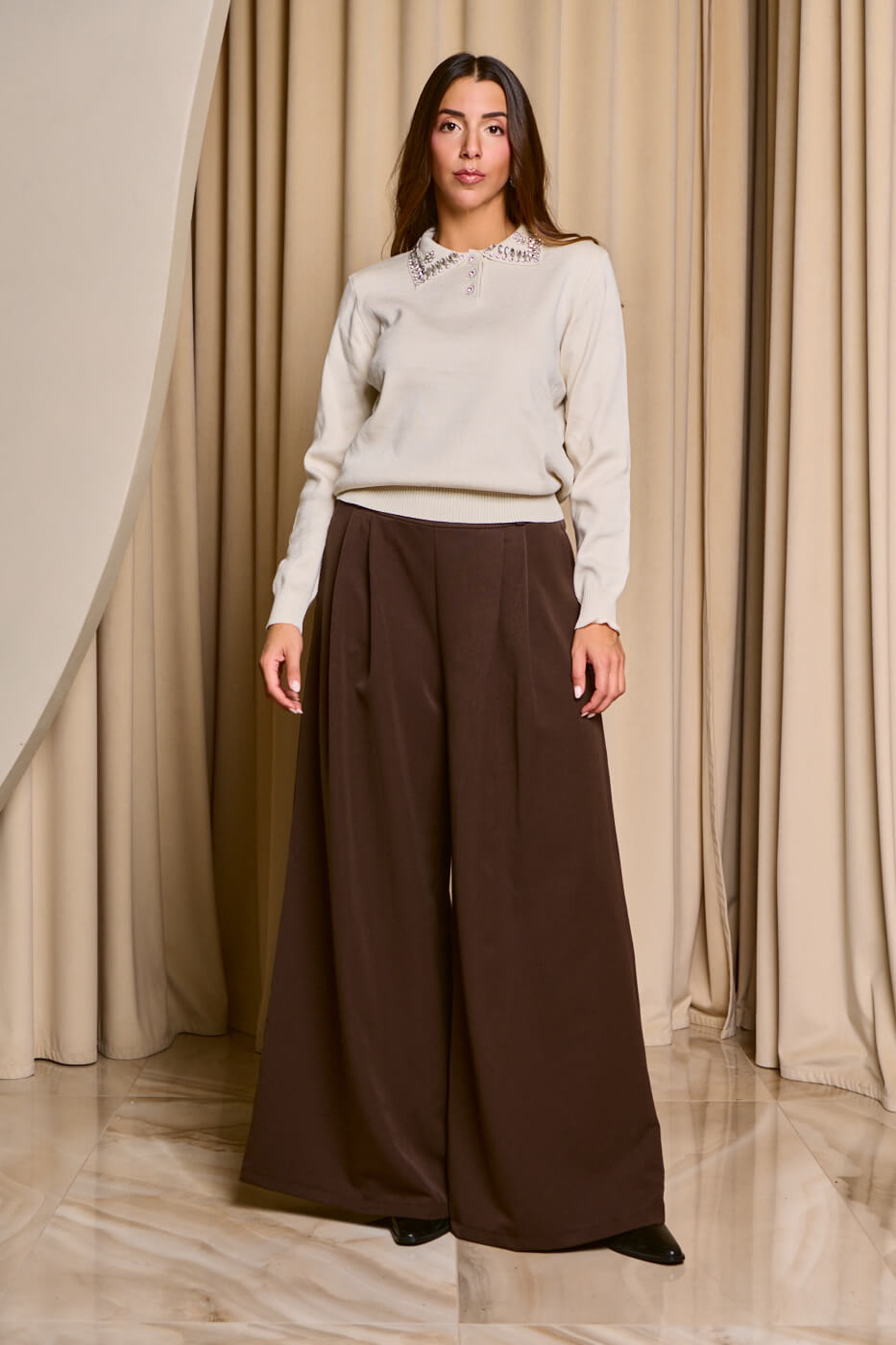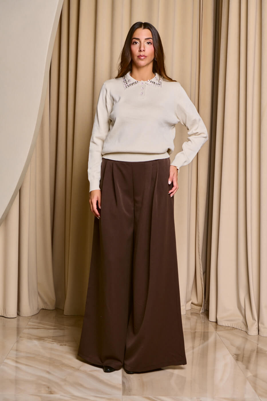 Μπλούζα πλεκτή καφέ με πέτρες στον γιακά