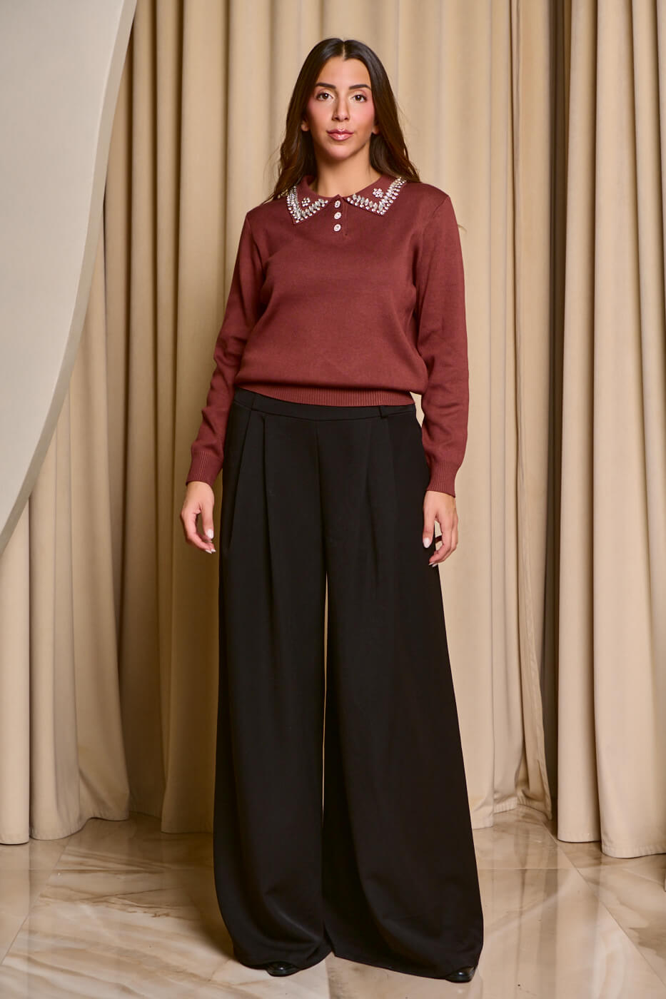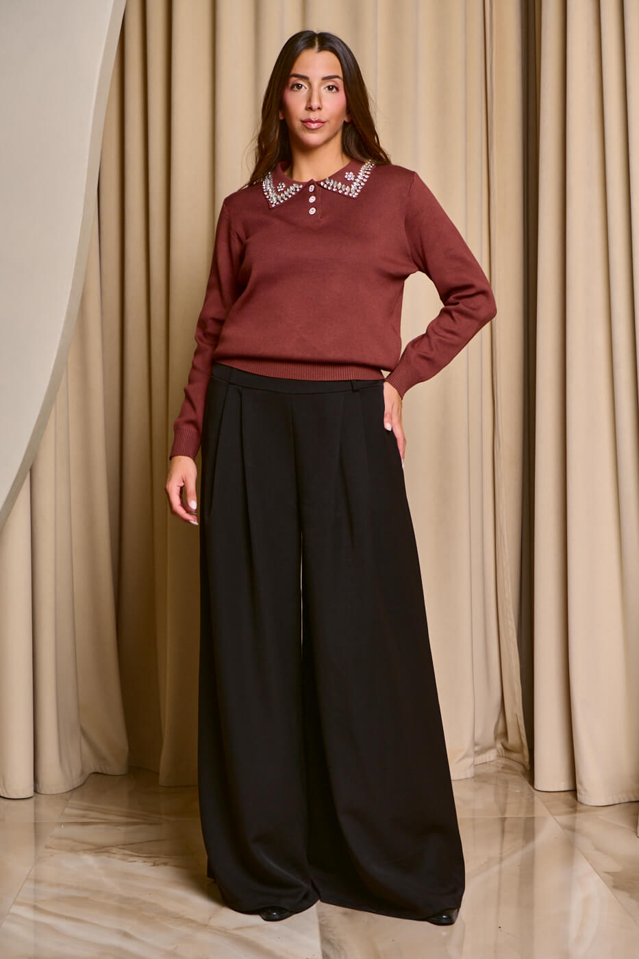 • Μπλούζα πλεκτή καφέ με πέτρες στον γιακά