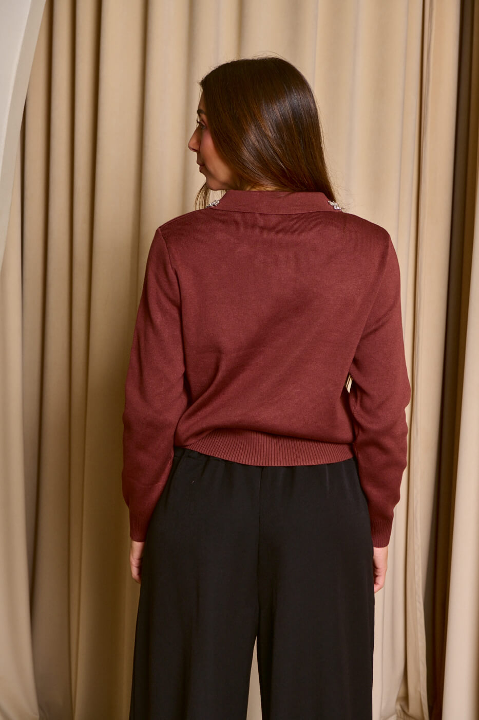Μπλούζα πλεκτή καφέ με πέτρες στον γιακά. Διαθέτει γιακά στολισμένο με διακριτικά αλλά εντυπωσιακά διακοσμητικά στοιχεία από πέτρες που προσθέτουν λάμψη. Επιπλέον έχει τρία κουμπιά στολισμένα με πέτρες και στρας.