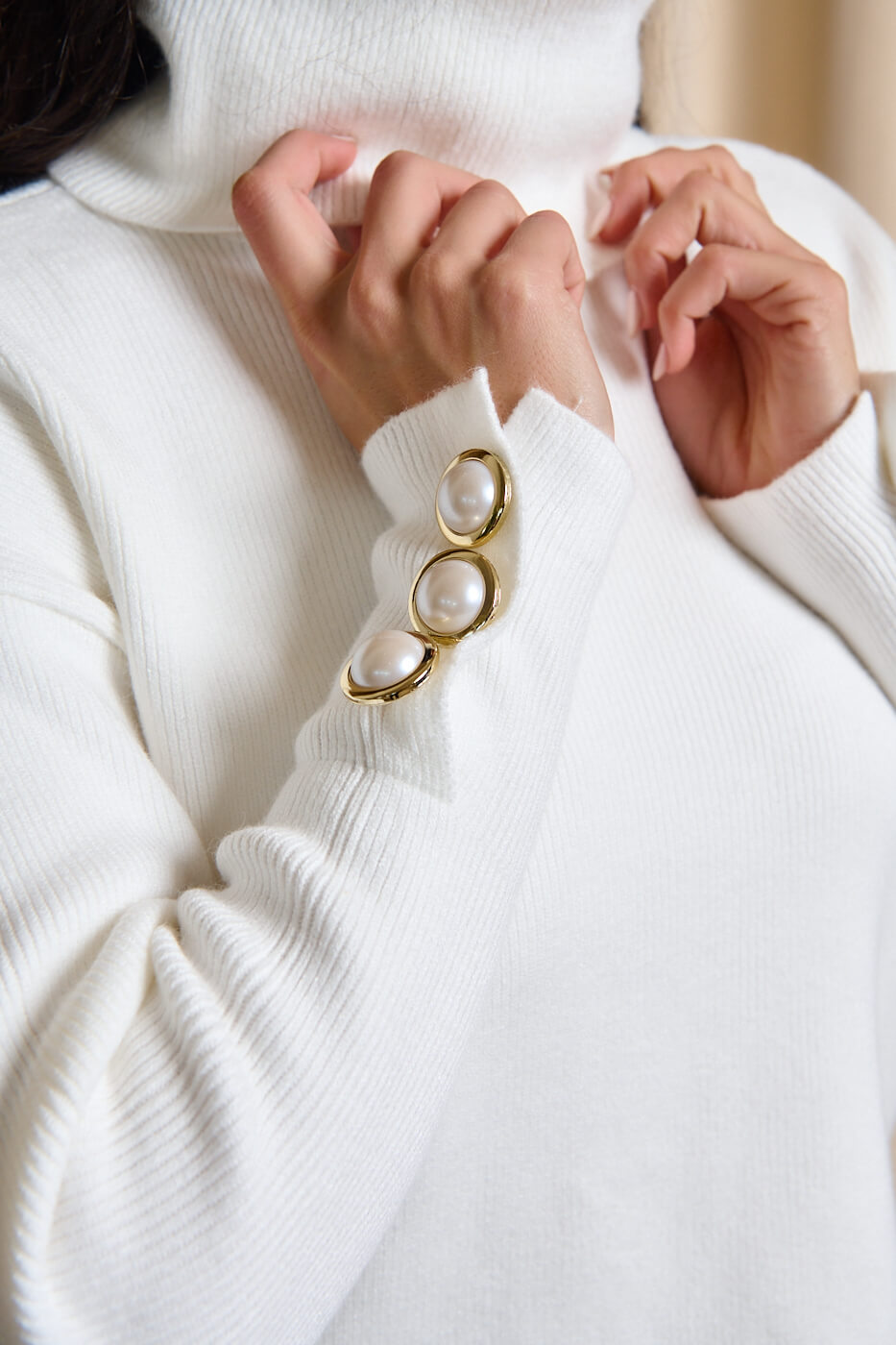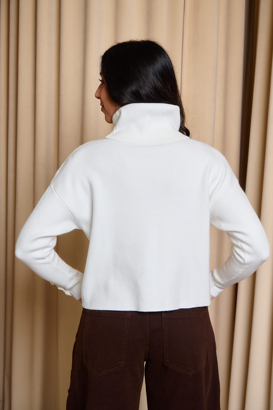 Μπλούζα πλεκτή λευκή. Η μαλακή πλέξη προσφέρει άνεση ενώ ο φαρδύς γιακάς προσθέτει κομψότητα. Η κοντή γραμμή του αναδεικνύει τη μέση και το καθιστά ιδανική επιλογή για ψηλόμεσα παντελόνια. Διαθέτει διακοσμητικά κουμπιά με πέρλα και χρυσό περίγραμμα στα μανίκια.