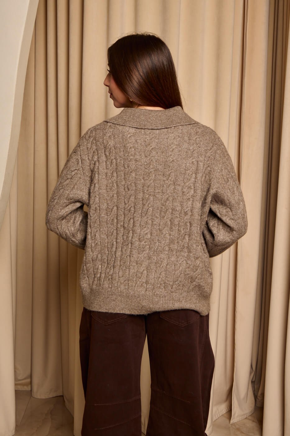 Μπλούζα πλεκτή με γιακά πούρο. Διαθέτει μακριά φαρδιά μανίκια με λάστιχο στο τελείωμα και γιακά με V άνοιγμα. Μία μπλούζα μαλακιά, ζεστή και ελαστική. Για όλες τις ώρες της ημέρας.