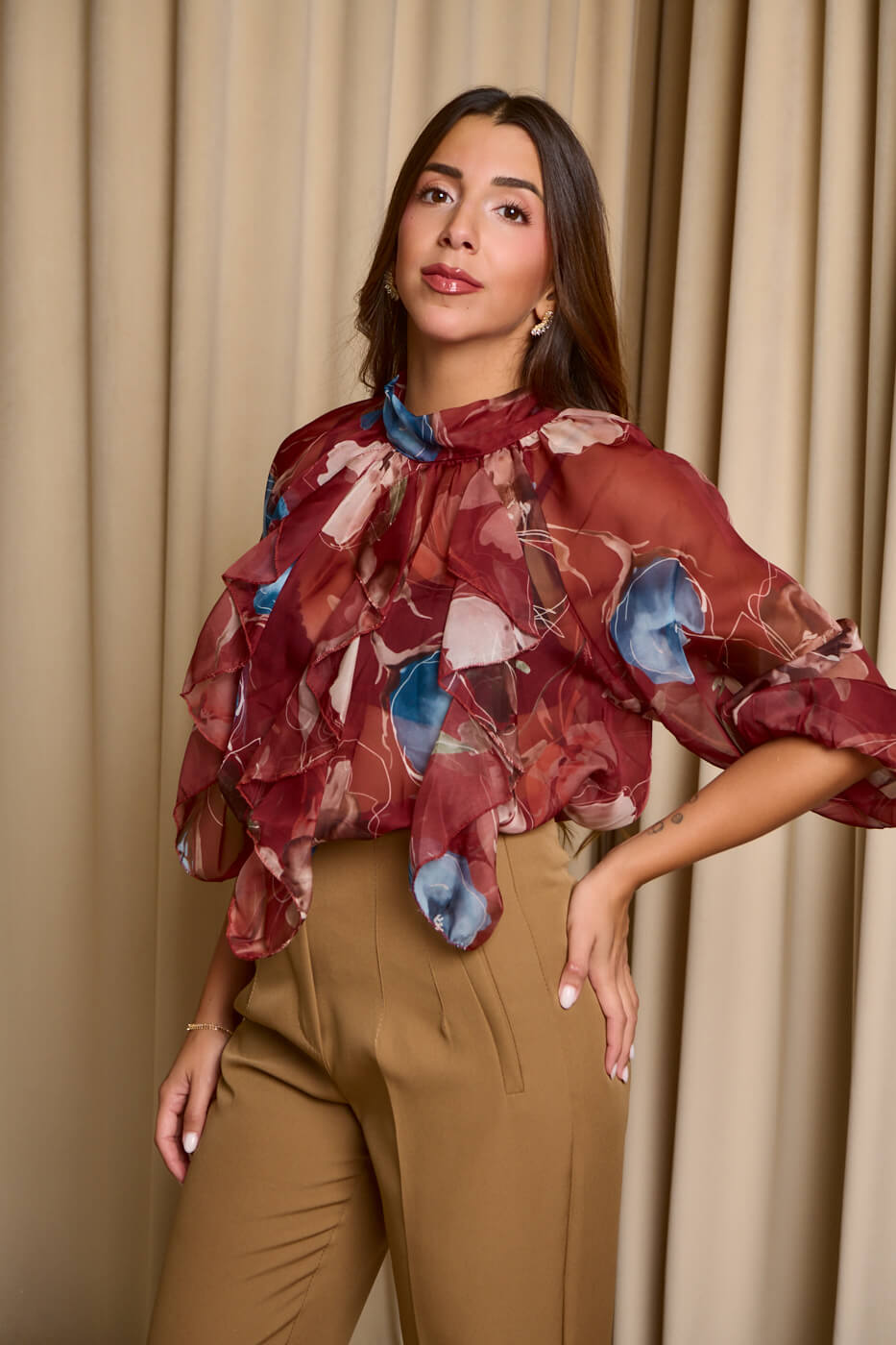Μπλούζα see through με φιόγκο και floral print μπορντό