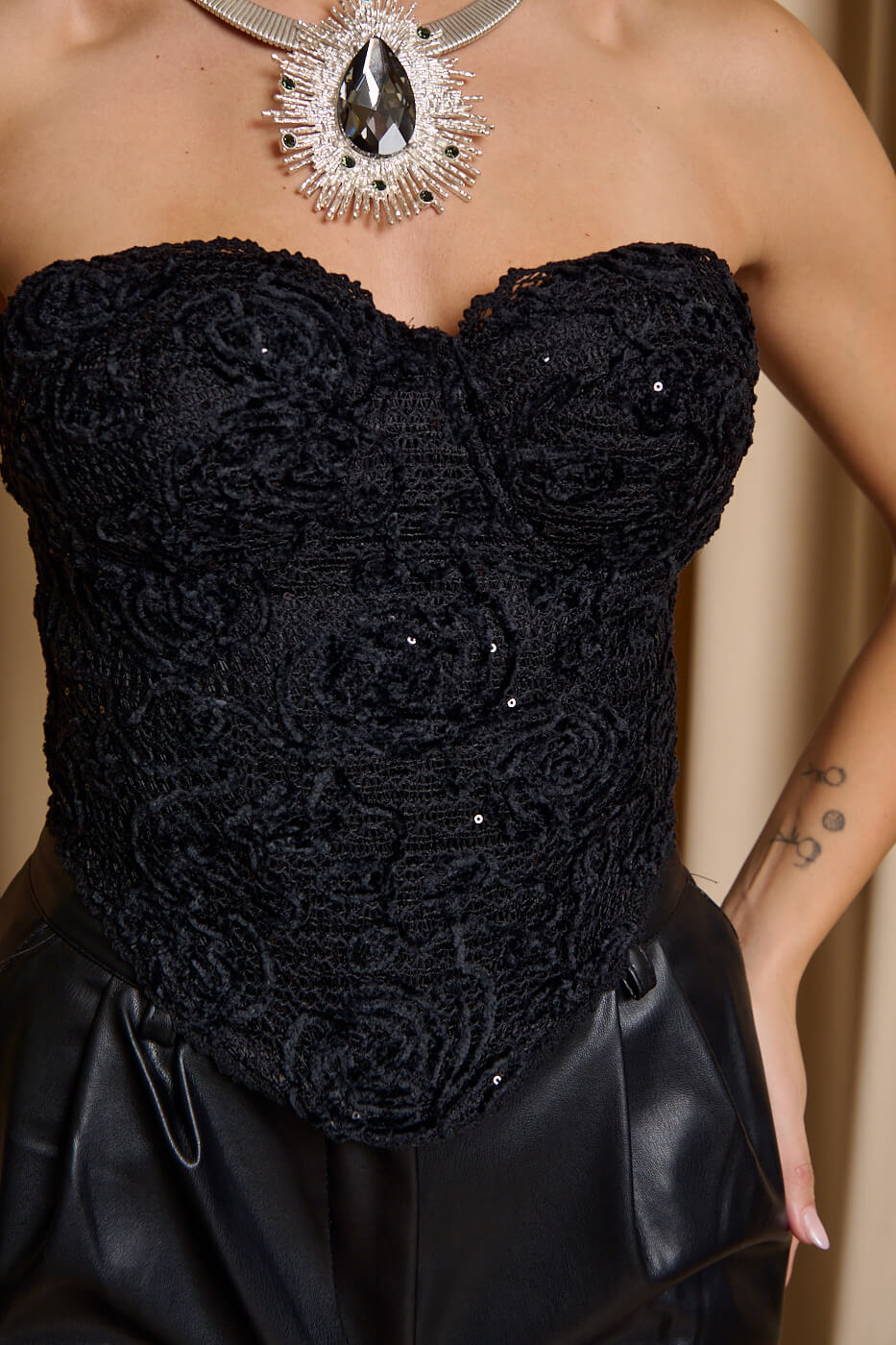 Μπλούζα στράπλες κορσές μαύρη. Ένας κορσές διακοσμημένος με δαντέλα ,ανάγλυφα velvet σχέδια και λαμπερές λεπτομέρειες. Διαθέτει εσωτερικά cups και μπανέλες για σταθερό κράτημα και σωστή εφαρμογή. Επιπλέον, έχει εσωτερική φόδρα και δένει πίσω με σχοινί.