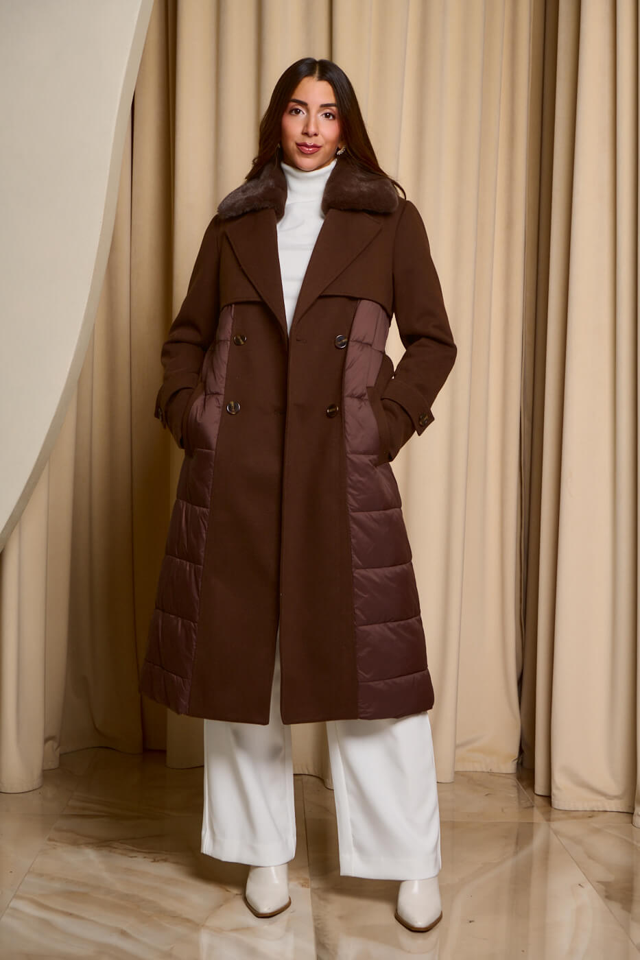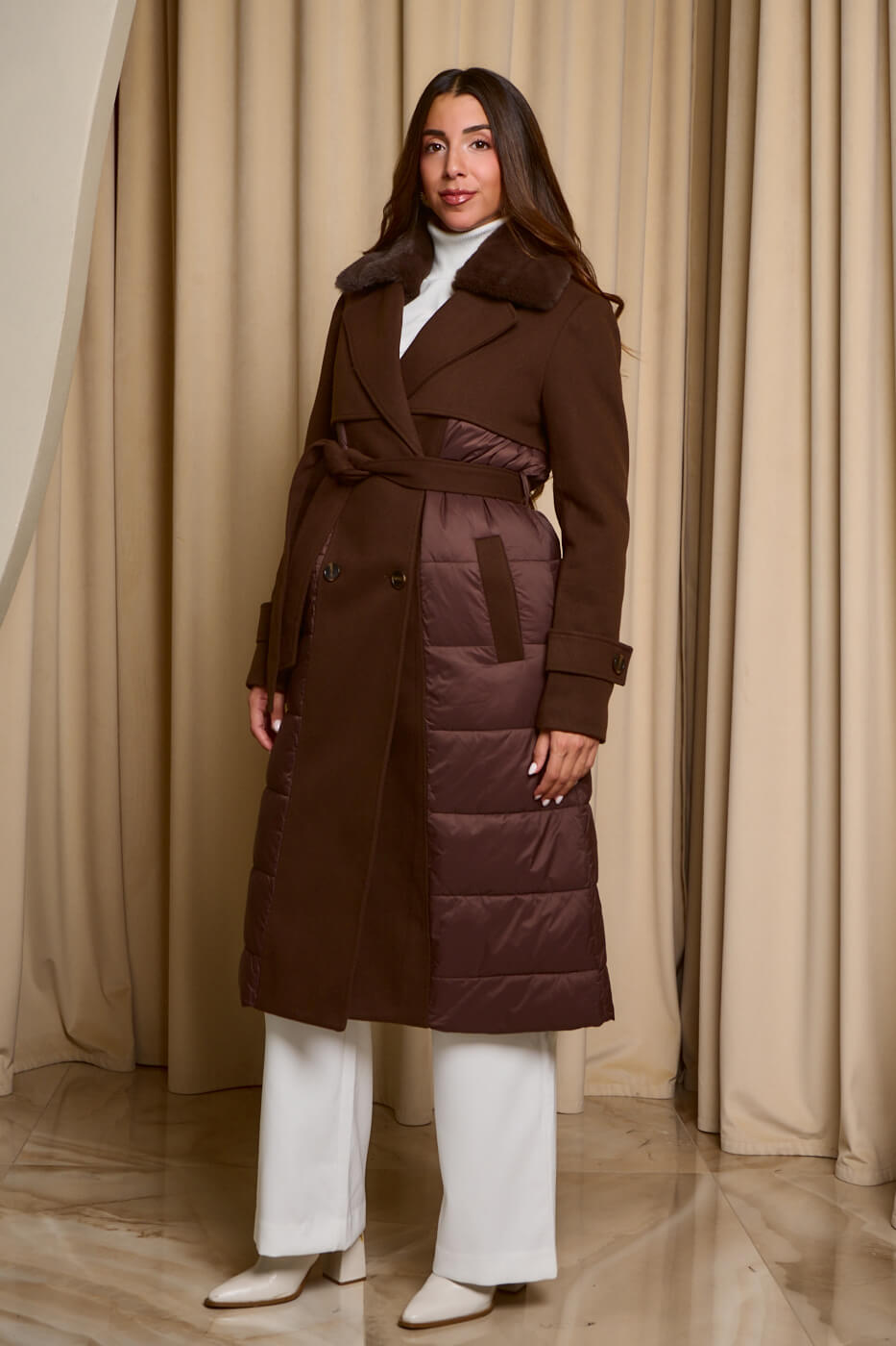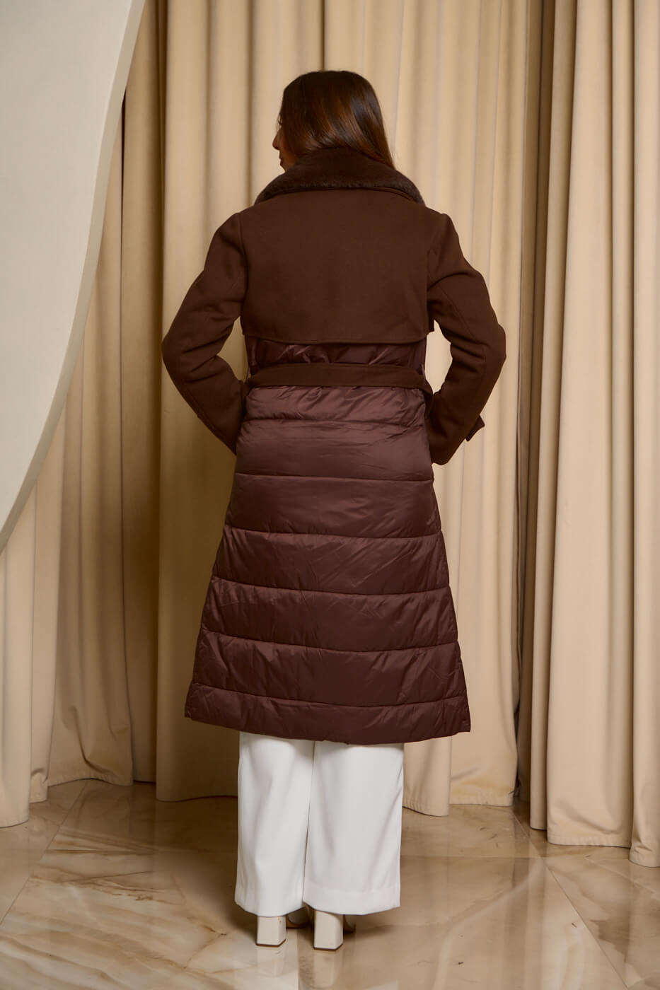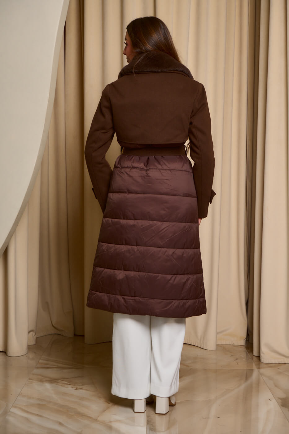 Μπουφάν καφέ με πέτο γιακά γούνα, εσωτερική φόδρα. Κλείνει μπροστά με κουμπιά και ζώνη. Στο τελείωμα στο μανίκι έχει λεπτομέρεια, δέσιμο με κουμπί. Διαθέτει διακοσμητικές τσέπες, μέση με θυλάκια ζώνης και στην πλάτη extra ύφασμα.