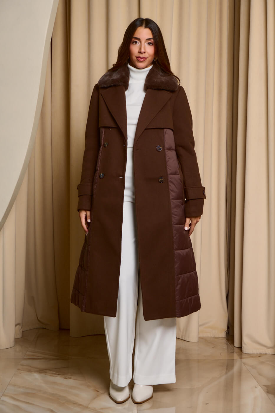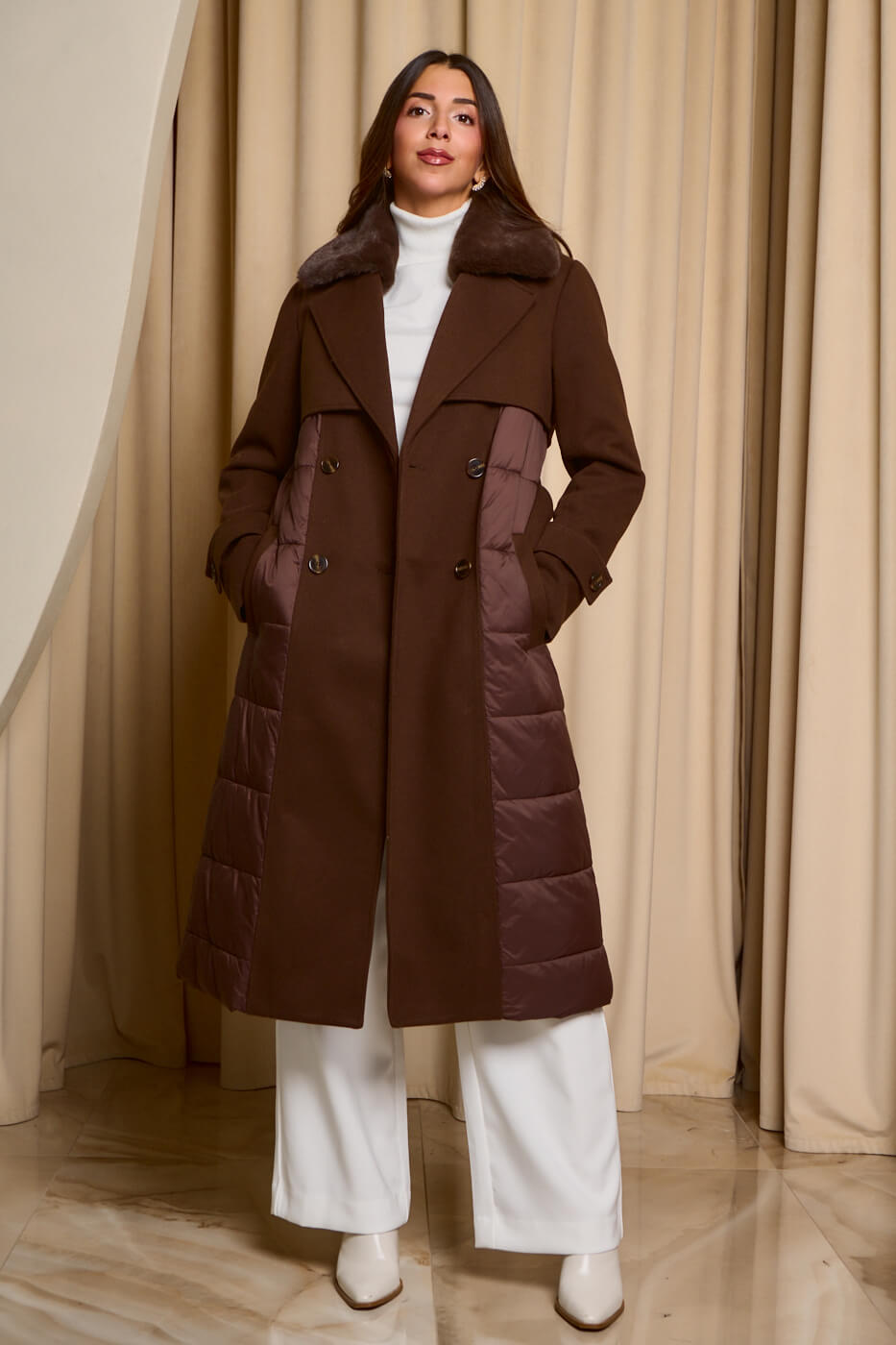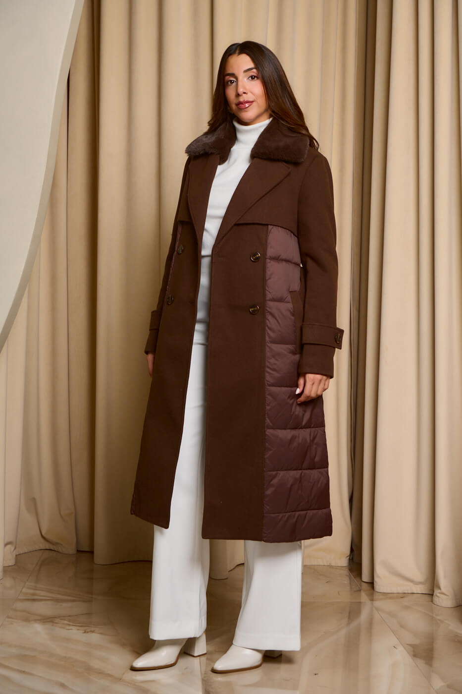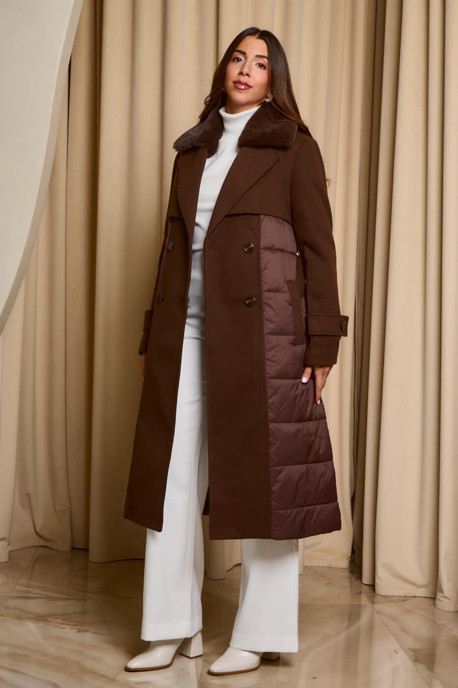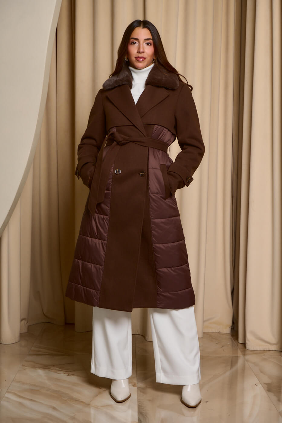 Μπουφάν καφέ με πέτο γιακά γούνα, εσωτερική φόδρα. Κλείνει μπροστά με κουμπιά και ζώνη. Στο τελείωμα στο μανίκι έχει λεπτομέρεια, δέσιμο με κουμπί. Διαθέτει διακοσμητικές τσέπες, μέση με θυλάκια ζώνης και στην πλάτη extra ύφασμα.