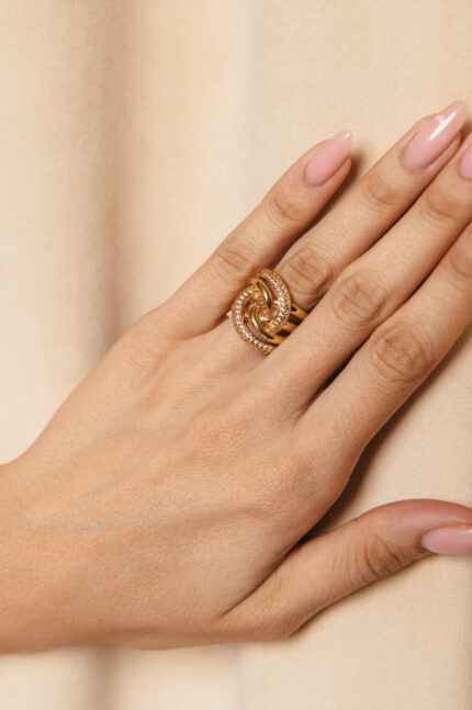 Δαχτυλίδι τριπλό με στρας χρυσό. Ένα δαχτυλίδι από ανοξείδωτο ατσάλι που μπορεί να φορεθεί όλες τις ώρες της ημέρας και να δώσει μια πινελιά λάμψης σε κάθε εμφάνιση. Περίμετρος: 8cm