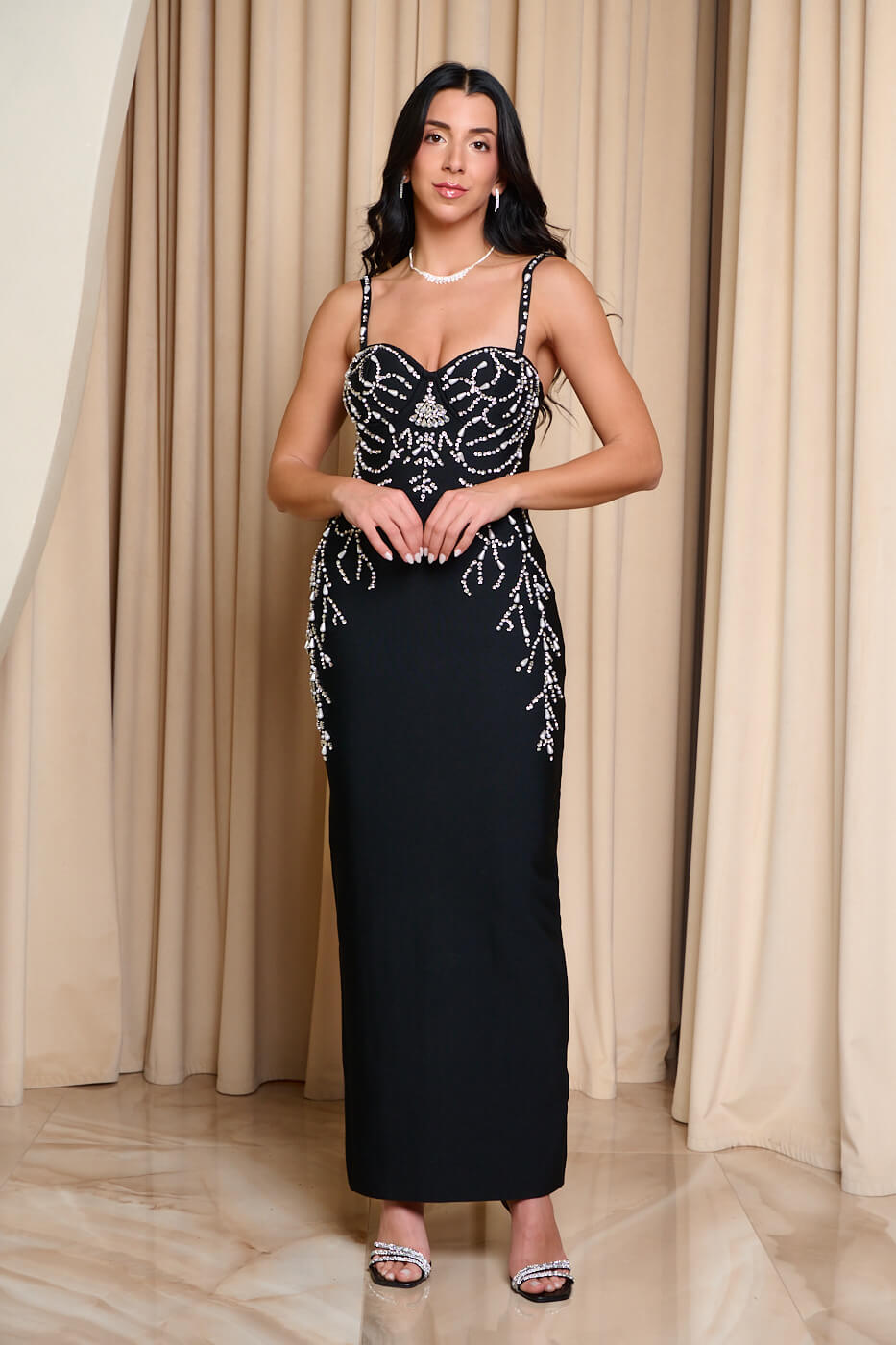 Φόρεμα maxi bandage με πέτρες και πέρλες μαύρο