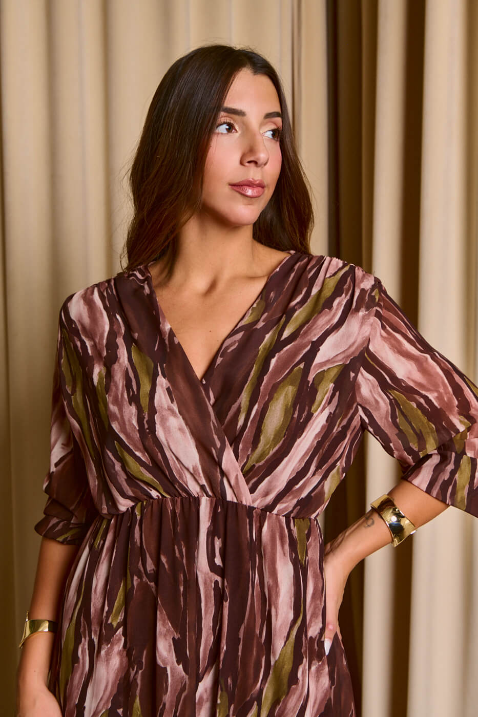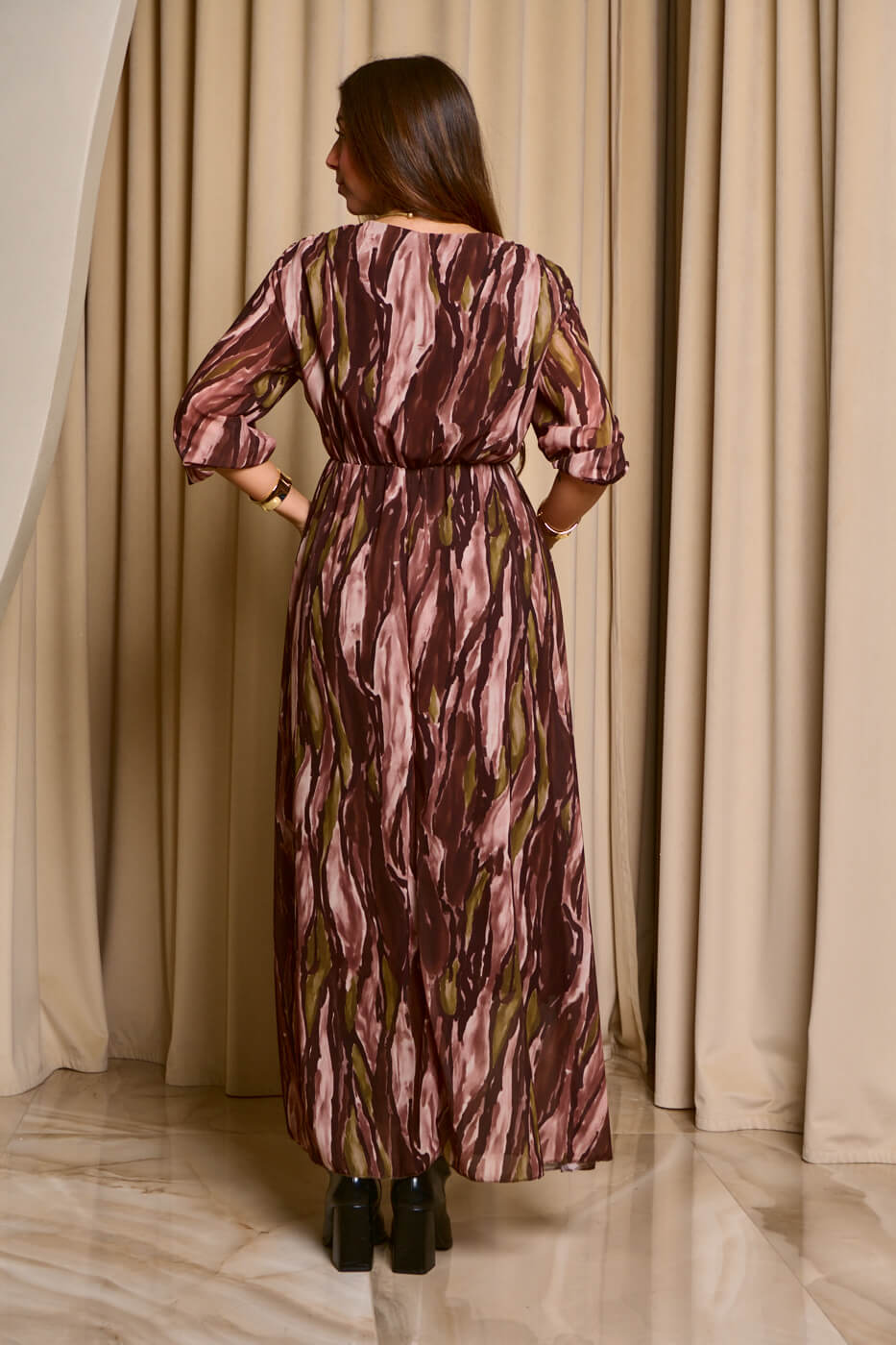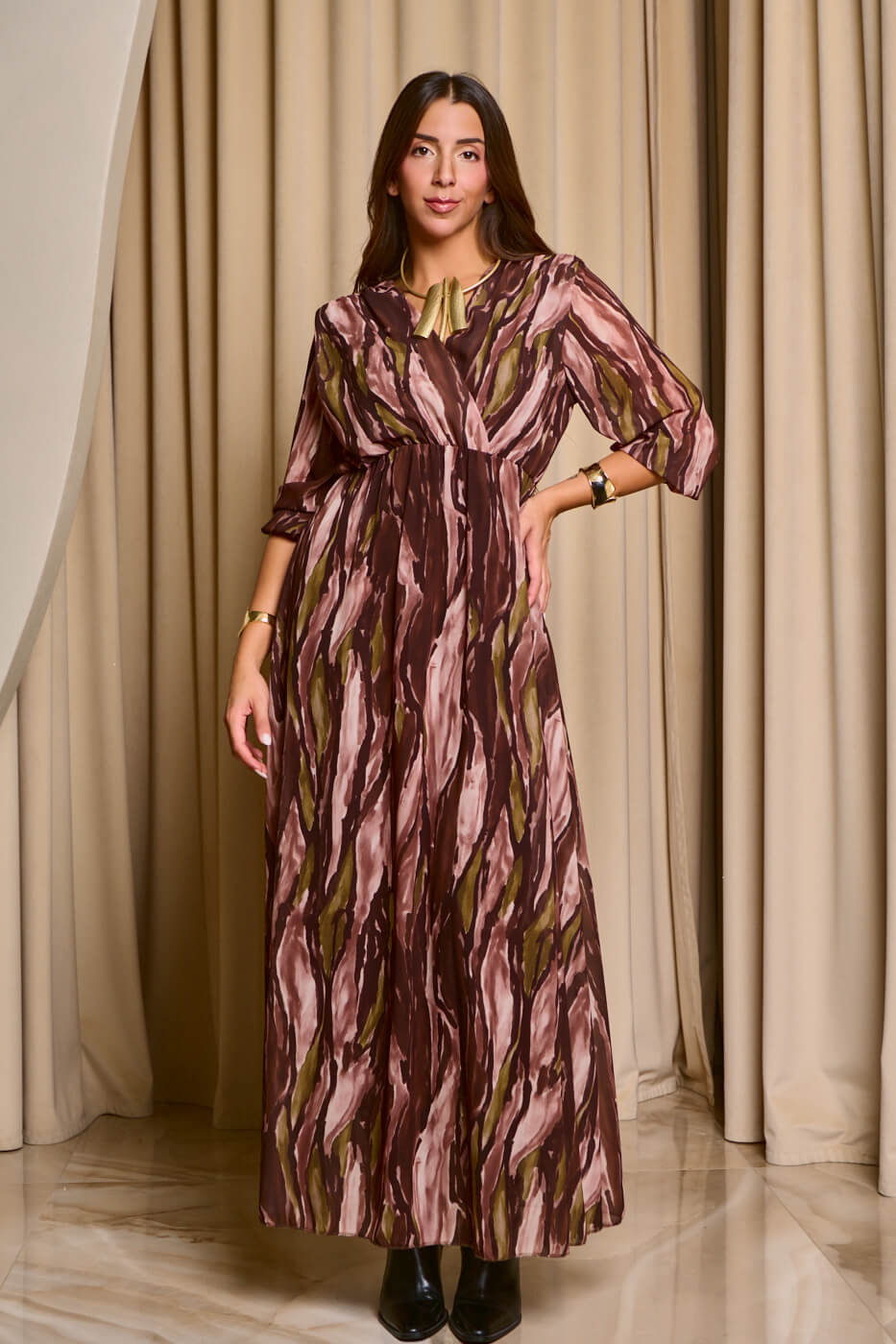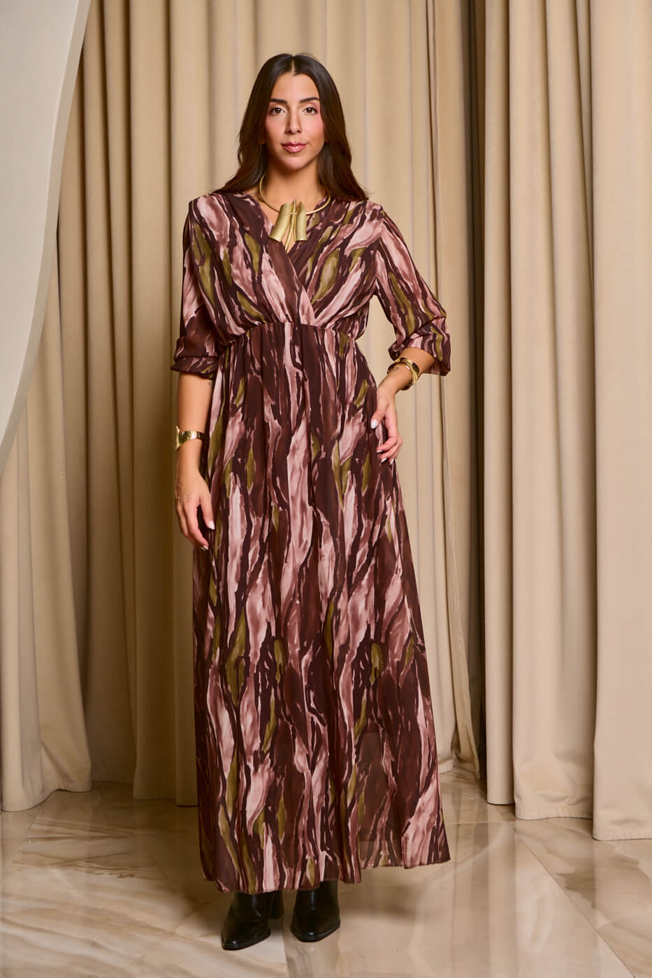 Φόρεμα maxi εμπριμέ με βαθύ V ντεκολτέ καφέ. Ένα ανάλαφρο και ελαστικό φόρεμα με λάστιχο στην μέση, καφέ βάση και μανίκια με λάστιχο στο τελείωμα. Διαθέτει εσωτερική φόδρα και έχει βαθύ V ντεκολτέ.