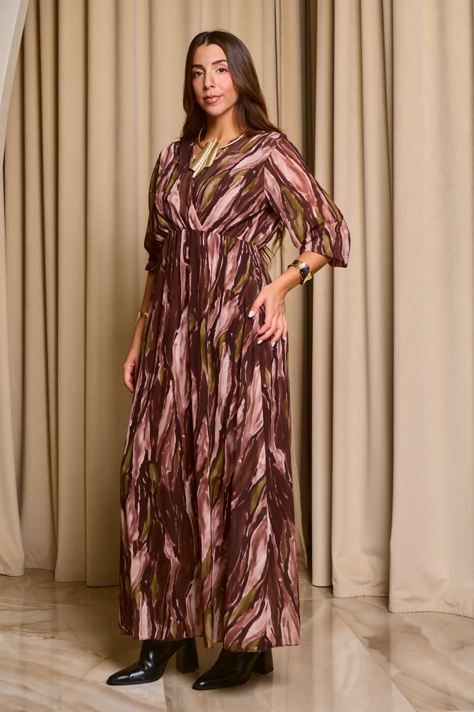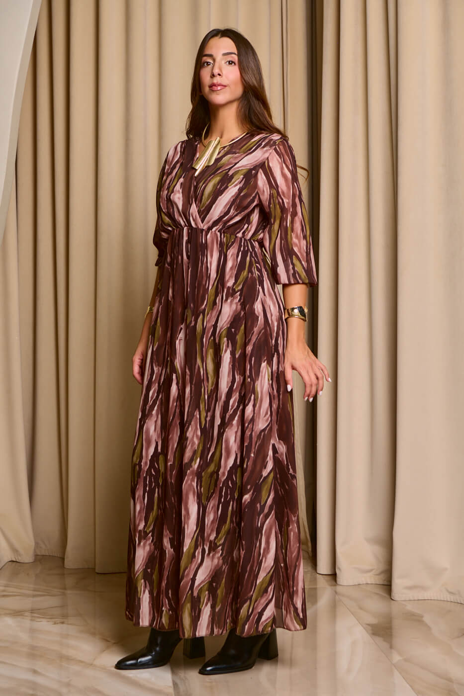 Φόρεμα maxi εμπριμέ με βαθύ V ντεκολτέ καφέ