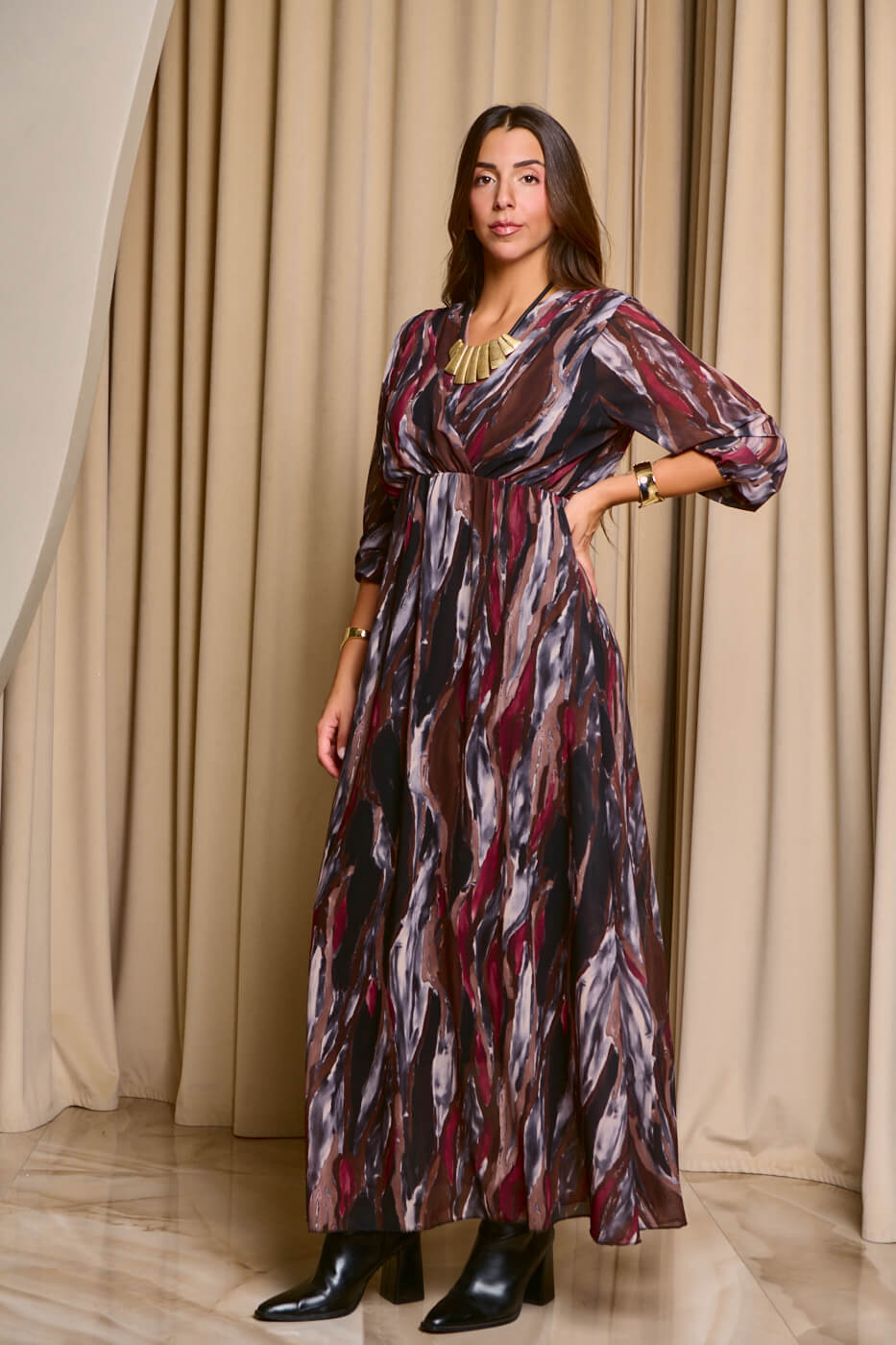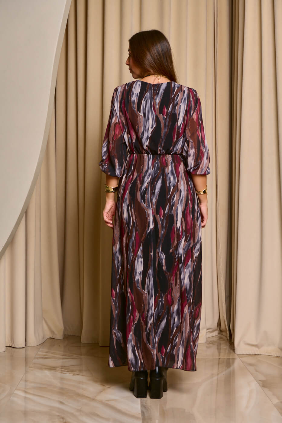 Φόρεμα maxi εμπριμέ με βαθύ V ντεκολτέ μπορντό