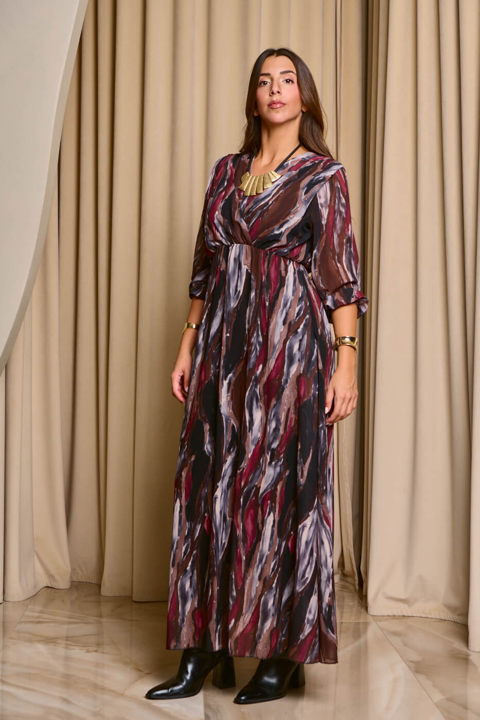 Φόρεμα maxi εμπριμέ με βαθύ V ντεκολτέ μαύρο. Ένα ανάλαφρο και ελαστικό φόρεμα με λάστιχο στην μέση, καφέ βάση και μανίκια με λάστιχο στο τελείωμα. Διαθέτει εσωτερική φόδρα και έχει βαθύ V ντεκολτέ.