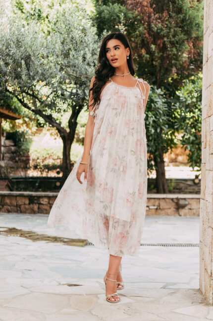 Φόρεμα midi floral balloon μανίκια με στρας μπλε εκρού.  Διαθέτει μεσοφόρι, στρογγυλή λαιμόκοψη, κοντά μανίκια με λάστιχο στο τελείωμα. Διαθέτει στρας σε όλο το φόρεμα και κλείνει με κουμπιά κόσμημα.