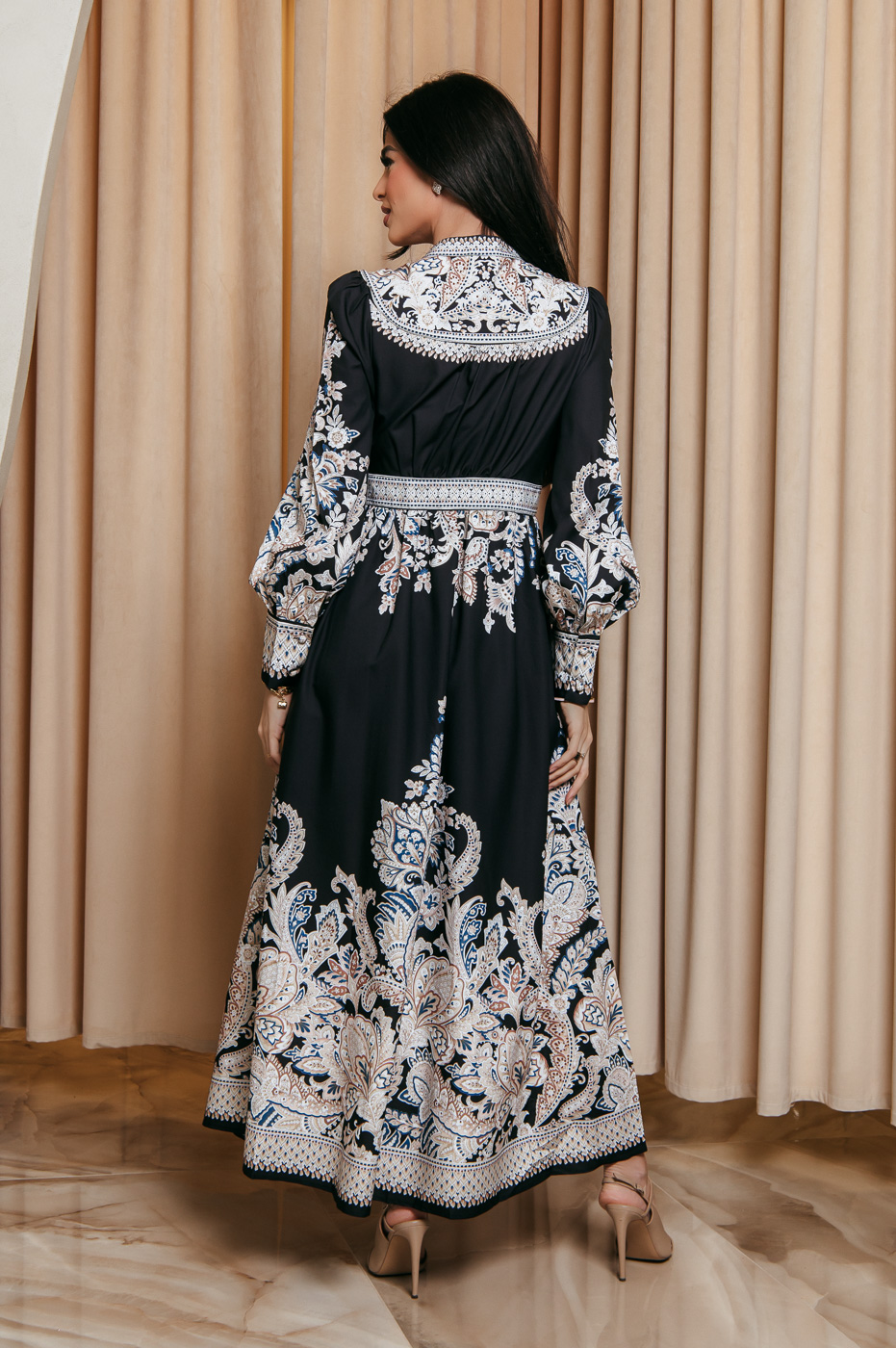 Φόρεμα maxi floral μαύρο. Διαθέτει V λαιμόκοψη, μάο γιακά, μακριά μανίκια με μανσέτα και κουμπί. Έχει σούρες στη μέση και κλείνει με κουμπιά από πάνω μέχρι κάτω. Ένα εντυπωσιακό φόρεμα για όλες τις ώρες της ημέρας.