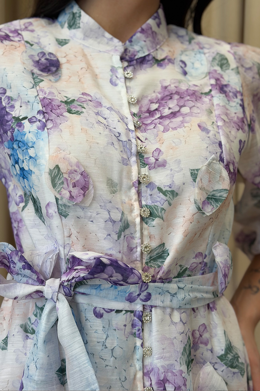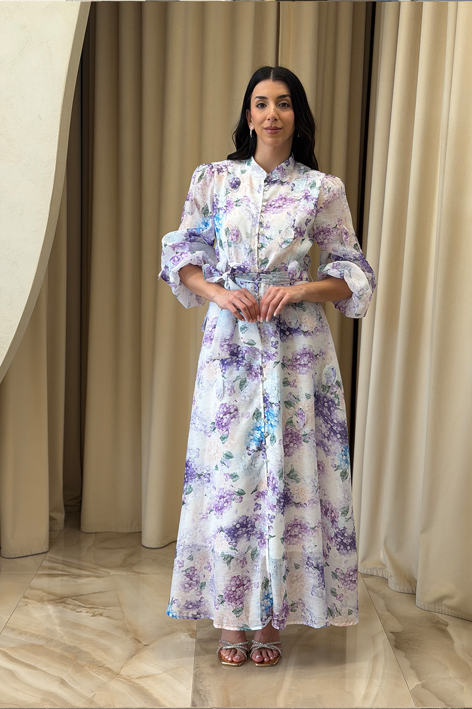 Φόρεμα maxi floral με 3D λεπτομέρειες άσπρο. Ένα maxi φόρεμα με  floral μοτίβο σε μωβ αποχρώσεις πάνω σε λευκή βάση.   Διαθέτει mao γιακά  και τρισδιάστατα φύλλα διάσπαρτα σε όλο του το μήκος.  Τα μανίκια είναι μακριά ημιδιάφανα με λάστιχο στο τελείωμα. Έχει κουμπιά κόσμημα που ανοίγουν και εσωτερική φόδρα. Το κάτω μέρος πέφτει σε άλφα γραμμή. Διαθέτει θυλήκια και δική του υφασμάτινη ζώνη με το ίδιο print.  Ιδανικό για επίσημες εμφανίσεις που ξεχωρίζουν για την κομψότητα και τη ρομαντική αισθητική τους.