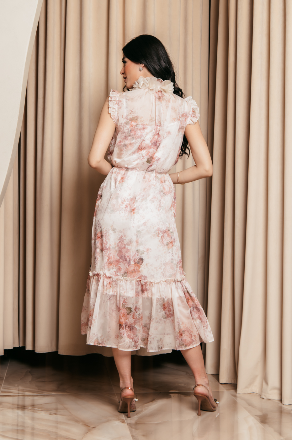 Φόρεμα maxi floral με 3D λουλούδια ροζ. Διαθέτει κοντά μανίκια με φραμπαλά, άνοιγμα V με 3d λουλούδια στο περίγραμμα και διακοσμητικό κορδόνι. Καταλήγει με φραμπαλά. Διαθέτει μεσοφόρι και έξτρα ζώνη. Ένα φόρεμα ιδιαίτερο και εντυπωσιακό για απογευματινές αλλά και βραδινές εμφανίσεις.