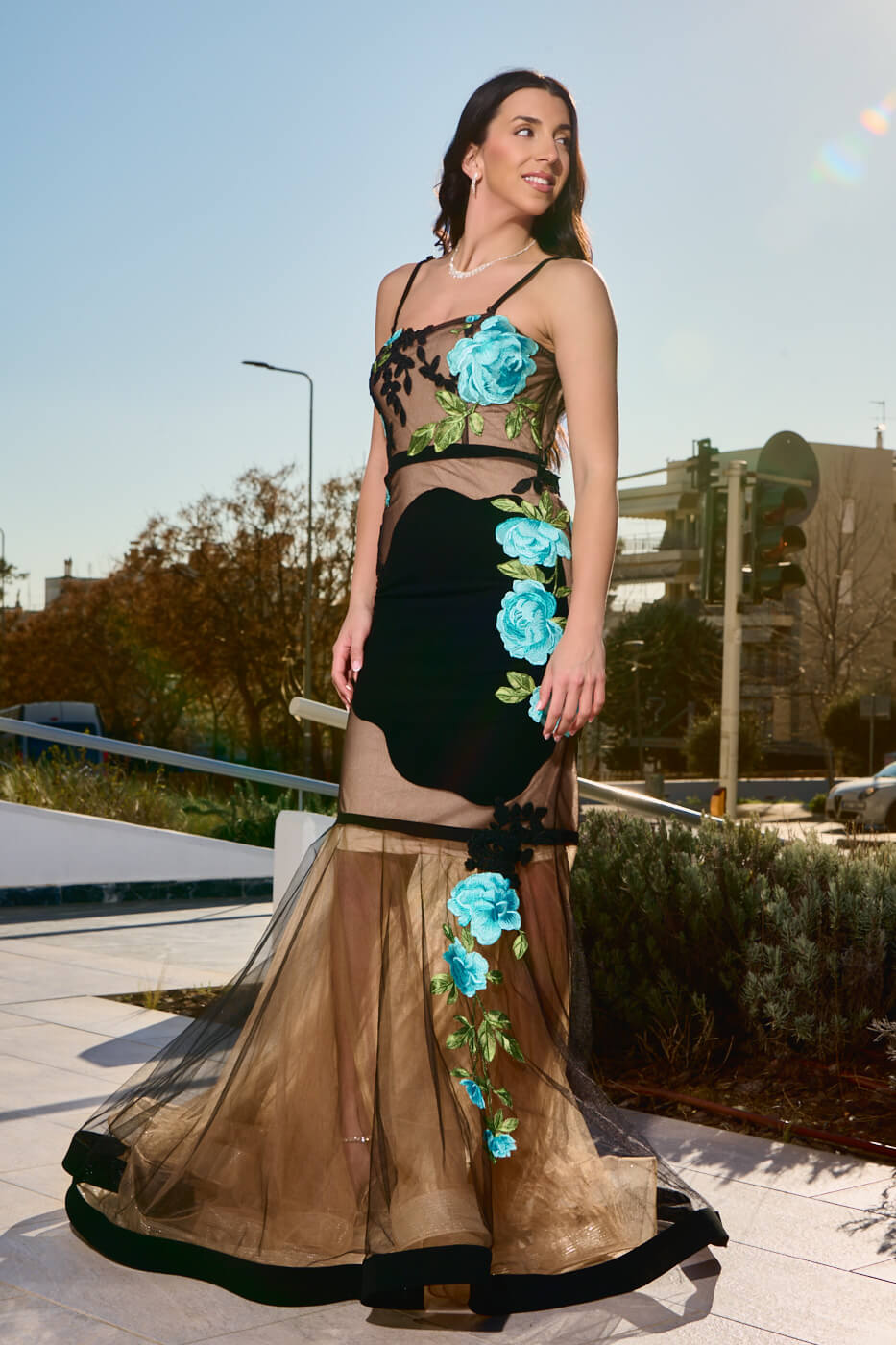Φόρεμα maxi γοργονέ με ανάγλυφα σχέδια nude – πετρόλ. Ένα άκρως εντυπωσιακό maxi φόρεμα σε nude βάση με ανάγλυφα μαύρα και πετρόλ σχέδια σε όλο του το μήκος. Το πάνω μέρος έχει λεπτές μαύρες αποσπώμενες τιράντες. Το κάτω μέρος είναι γοργονέ με διπλή επένδυση από τούλι στο τελείωμα και ουρά πίσω. Διαθέτει δικό του αποσπώμενο στράπλες μεσοφόρι σε nude απόχρωση. Κλείνει με δέσιμο τύπου κορσέ με κορδέλα πίσω. Ιδανικό για ξεχωριστές επίσημες εμφανίσεις που σίγουρα δεν περνούν απαρατήρητες.
