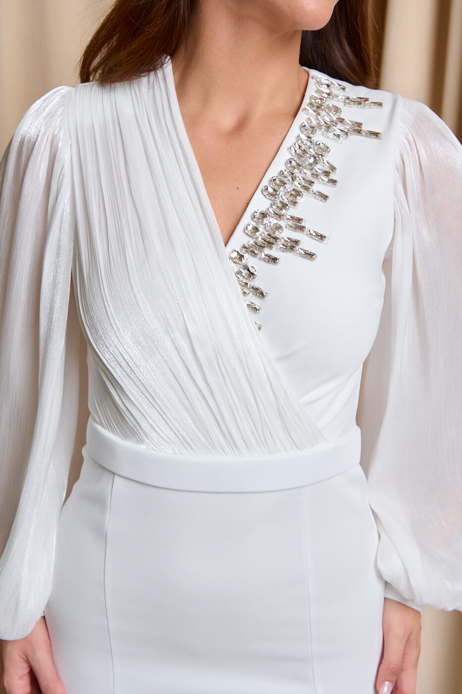 Φόρεμα maxi γοργονέ με διακοσμητικές πέτρες άσπρο . Ένα μοναδικό φόρεμα ιδανικό για ιδιαίτερες περιστάσεις. Το μπούστο είναι κρουαζέ με διακοσμητικές λαμπερές πέτρες στη μια πλευρά. Διαθέτει μακριά ημιδιάφανα μανίκια με μανσέτες στο τελείωμα και διακοσμητικό κουμπί κόσμημα. Έχει εσωτερική φόδρα, βάτες στους ώμους και κλείνει με φερμουάρ πίσω. Η γοργονέ γραμμή του αγκαλιάζει πολύ όμορφα το σώμα και κολακεύει τη σιλουέτα. Ένα εντυπωσιακό φόρεμα που συνδυάζει απλότητα και λάμψη με απόλυτη αρμονία.