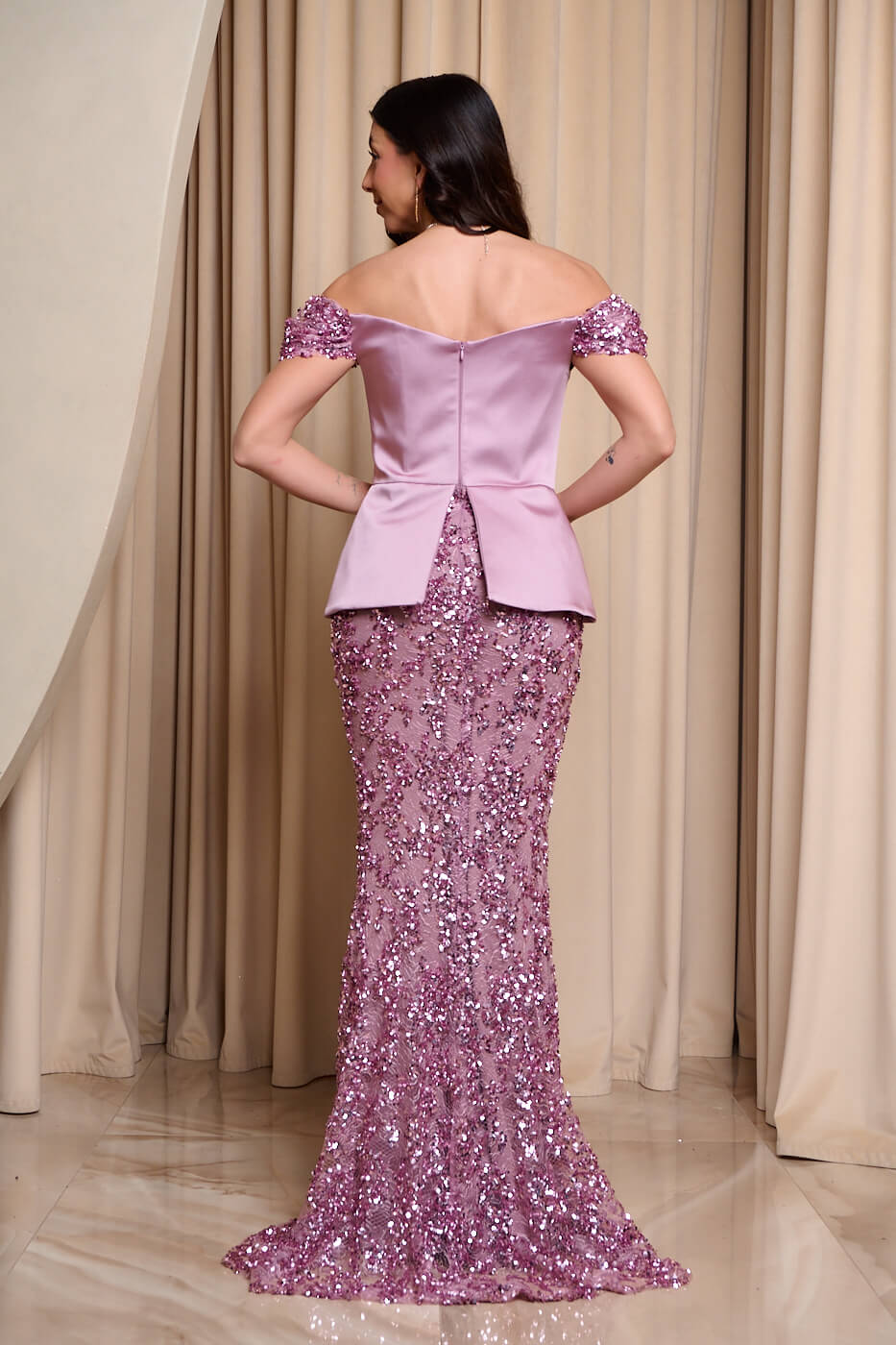 Το πάνω μέρος είναι off shoulder με παγιέτες στα μανίκια και σατέν μπούστο με κολακευτικό πέπλουμ τελείωμα στη μέση. Το κάτω μέρος είναι διακοσμημένο με παγιέτες σε γοργονέ γραμμή που κολακεύει τη σιλουέτα. Διαθέτει εσωτερικά cups και φόδρα. Κλείνει με φερμουάρ πίσω.