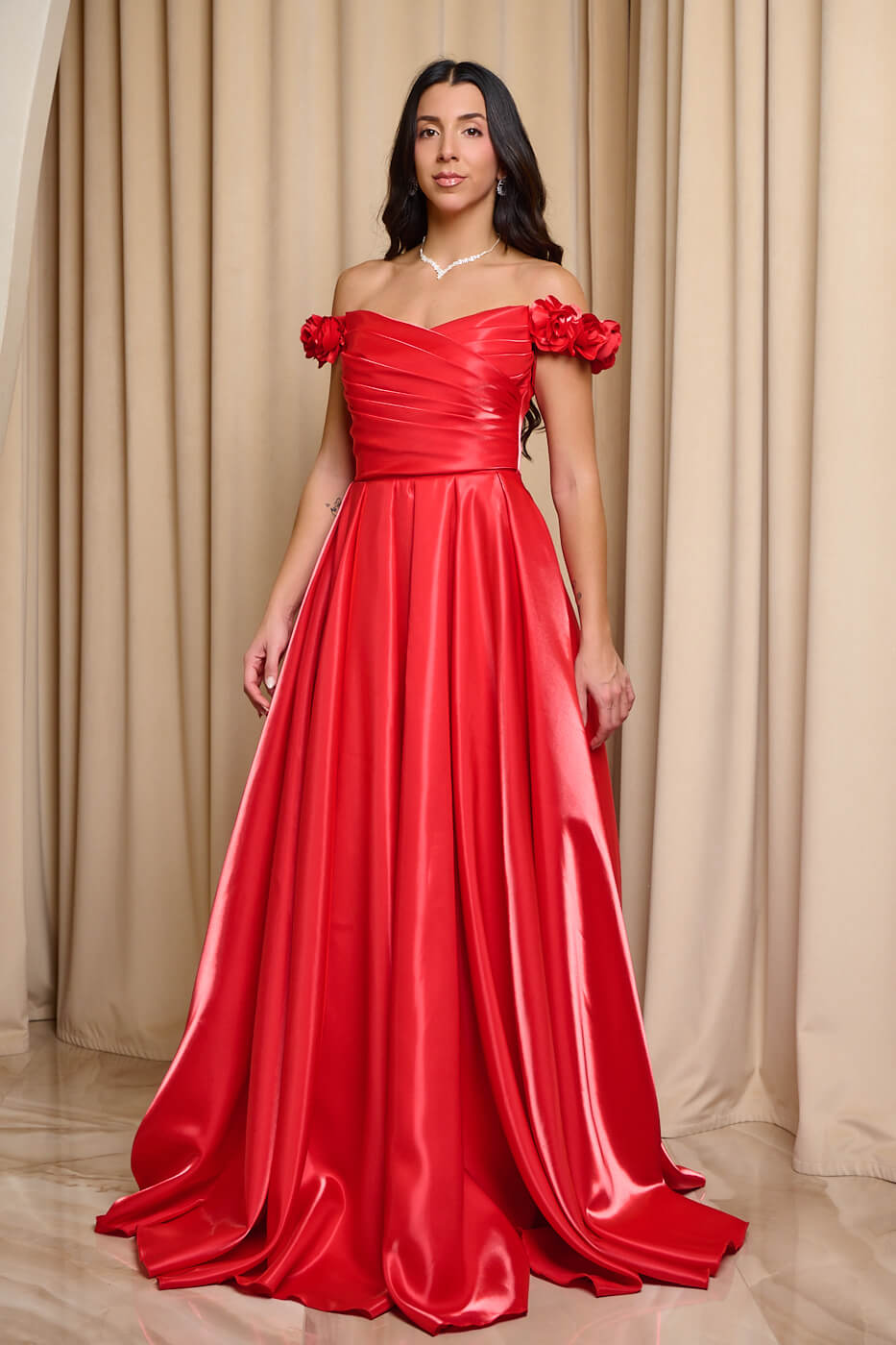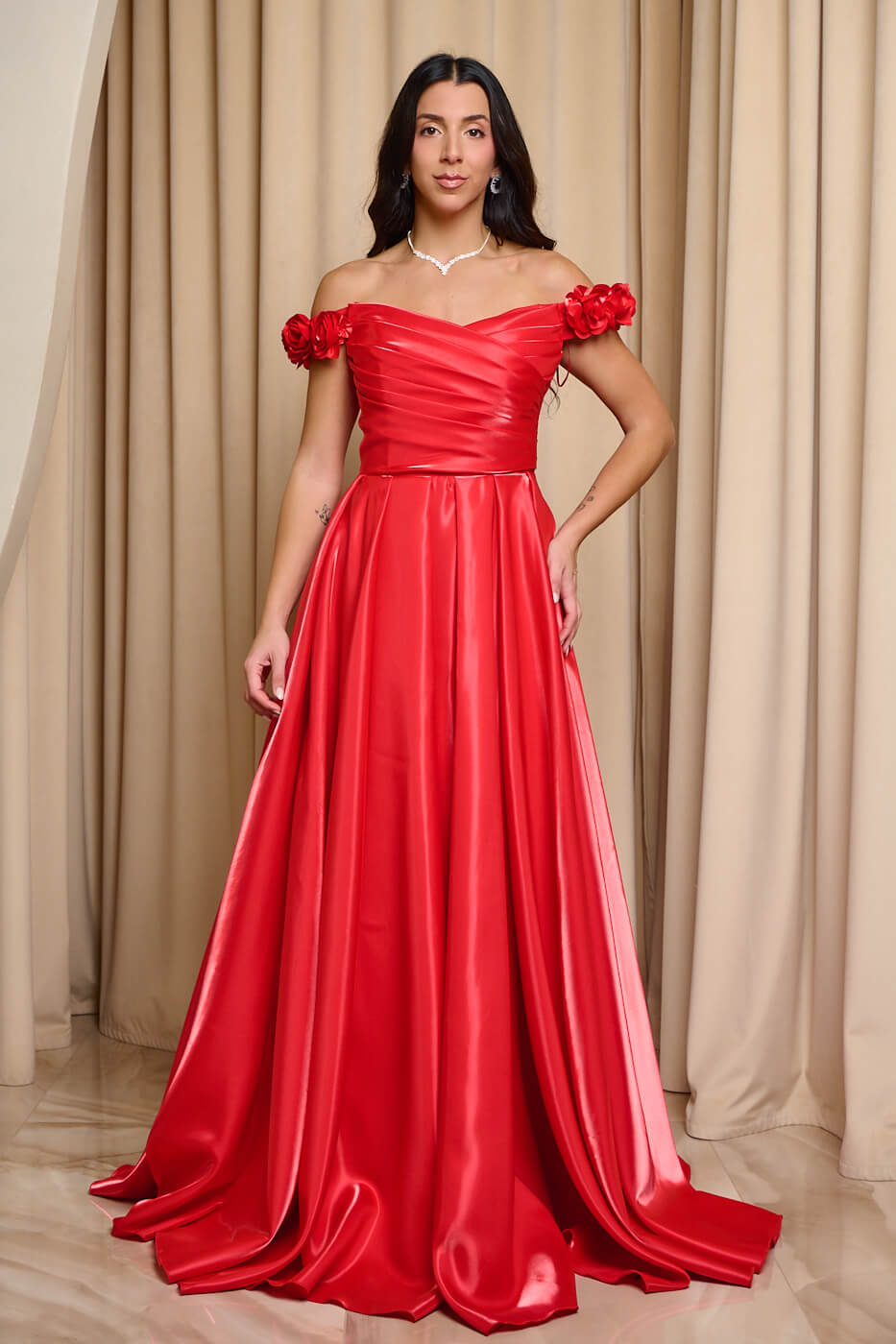 Φόρεμα maxi γυαλιστερός ταφτάς και τιράντες με λουλούδια κόκκινο. Με ντραπέ μπούστο ενισχυμένο με cups, στη μέση συνεχίζει με πιέτες και καταλήγει σε κλος, προσφέρει άνεση και χάρη. Διαθέτει τιράντες διακοσμημένες με 3D λουλούδια. Κατασκευασμένο από γυαλιστερό ταφτά με λαμπερό φινίρισμα. Έχει εσωτερική φόδρα και διαθέτει φερμουάρ στην πλάτη για εύκολη εφαρμογή.
