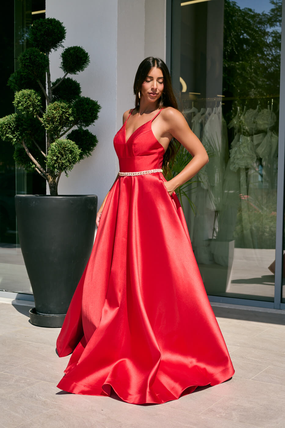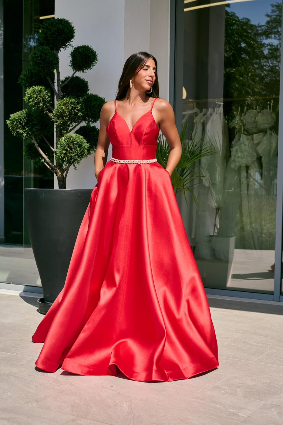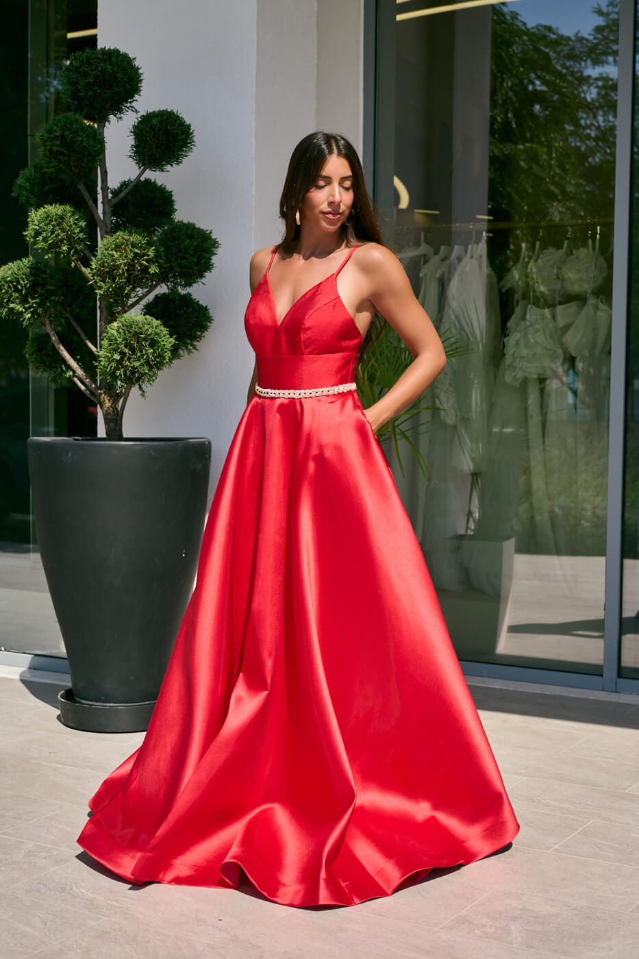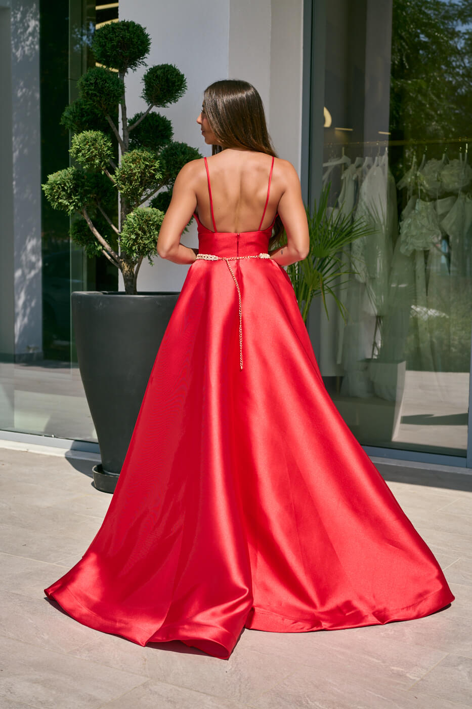 Φόρεμα maxi κλος με λεπτές τιράντες κόκκινο. Αριστοκρατικό και μοντέρνο με σατέν υφή. Έχει βαθύ ντεκολτέ στο στήθος που προσθέτει ρομαντική αίσθηση. Διαθέτει τσέπες, cups και εσωτερική φόδρα. Στο πίσω μέρος αφήνει λίγο ανοιχτή την πλάτη και κλείνει με φερμουάρ.