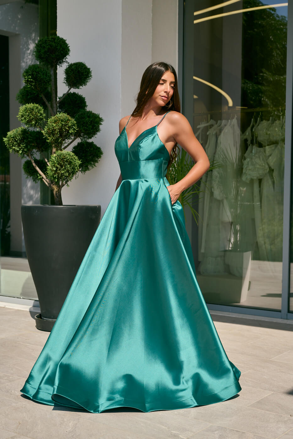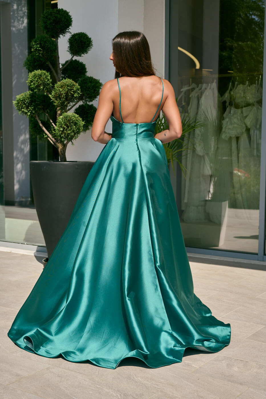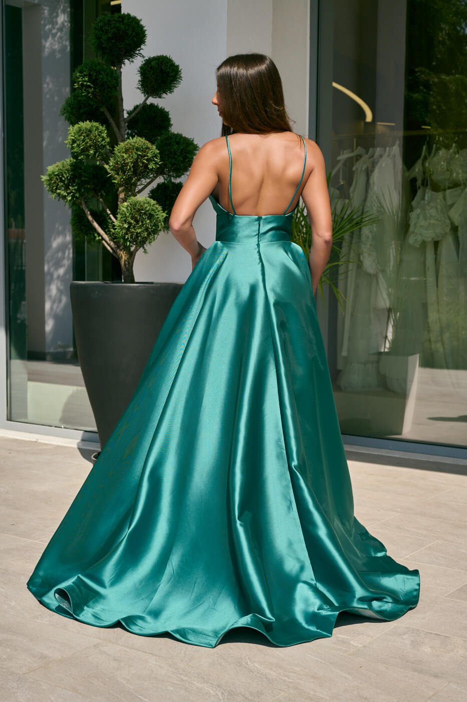 Φόρεμα maxi κλος με λεπτές τιράντες κυπαρισσί. Αριστοκρατικό και μοντέρνο με σατέν υφή. Έχει βαθύ ντεκολτέ στο στήθος που προσθέτει ρομαντική αίσθηση. Διαθέτει τσέπες, cups και εσωτερική φόδρα. Στο πίσω μέρος αφήνει λίγο ανοιχτή την πλάτη και κλείνει με φερμουάρ.