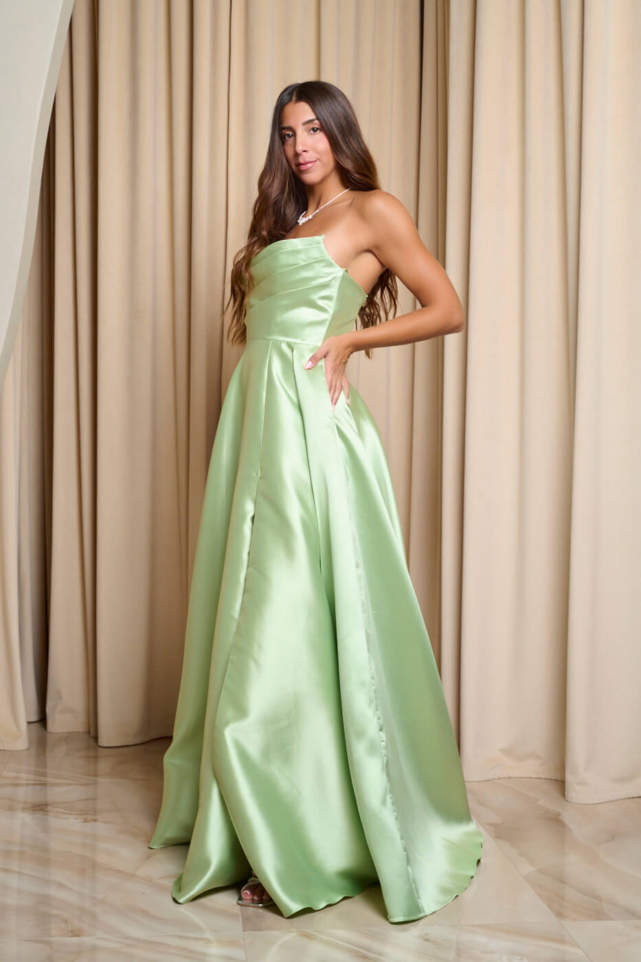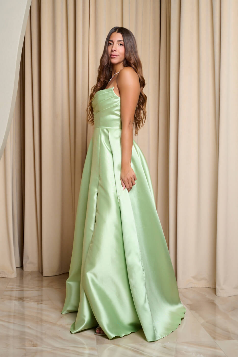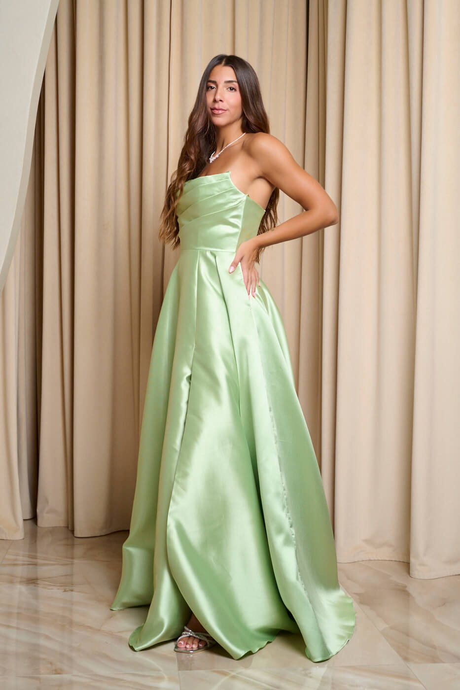 Φόρεμα maxi κλος μέντα. Αριστοκρατικό και μοντέρνο με σατέν υφή. Διαθέτει εντυπωσιακό σκίσιμο στο πλάι. Έχει ιδιαίτερο σχέδιο στο στήθος σε σχήμα τριαντάφυλλου που προσθέτει ρομαντική αίσθηση. Εσωτερικά η σιλικόνη στο μπούστο εξασφαλίζει άψογο κράτημα και σταθερότητα. Διαθέτει τσέπες, αποσπώμενες τιράντες και φερμουάρ στο πίσω μέρος.