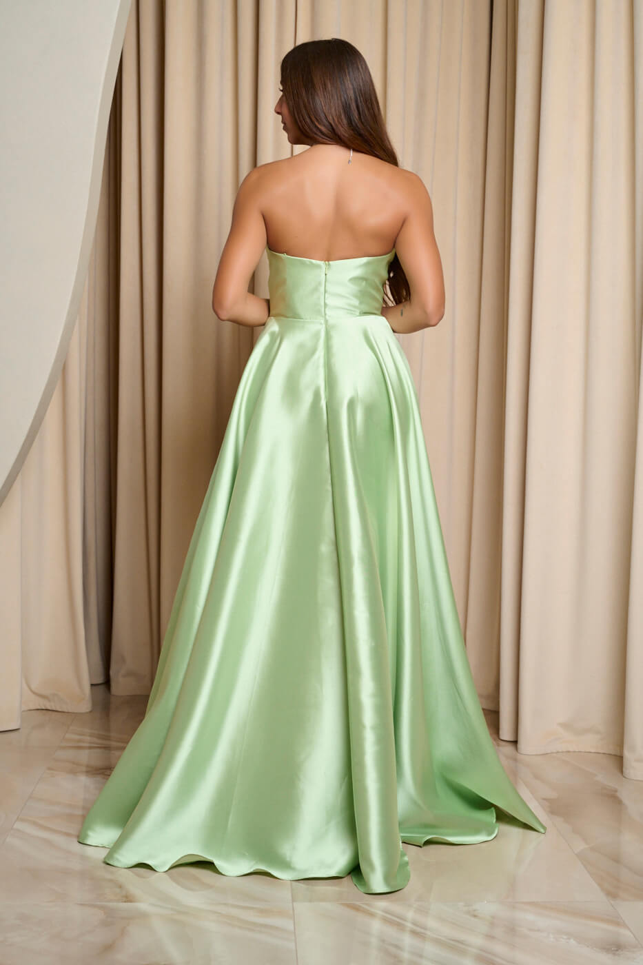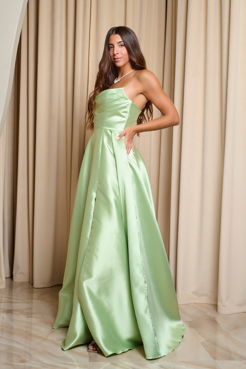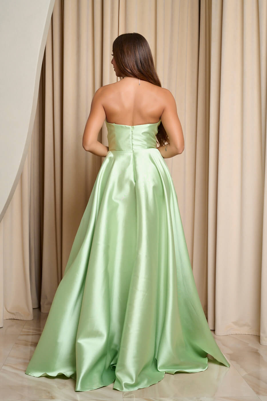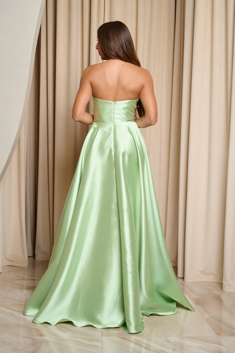Φόρεμα maxi κλος μέντα. Αριστοκρατικό και μοντέρνο με σατέν υφή. Διαθέτει εντυπωσιακό σκίσιμο στο πλάι. Έχει ιδιαίτερο σχέδιο στο στήθος σε σχήμα τριαντάφυλλου που προσθέτει ρομαντική αίσθηση. Εσωτερικά η σιλικόνη στο μπούστο εξασφαλίζει άψογο κράτημα και σταθερότητα. Διαθέτει τσέπες, αποσπώμενες τιράντες και φερμουάρ στο πίσω μέρος.