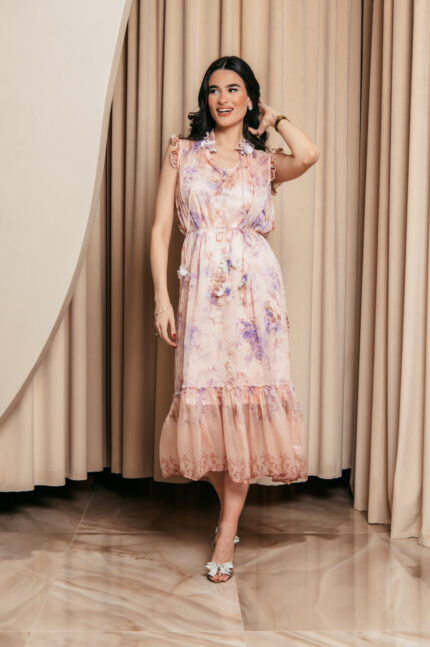 • Φόρεμα maxi ροζ με Βολάν και λεπτές τιράντες