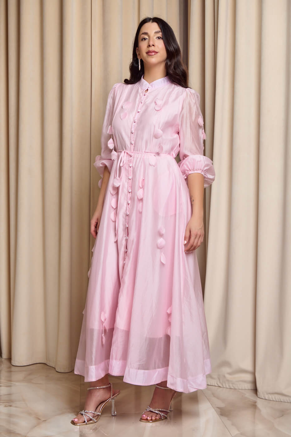 Φόρεμα maxi με 3D λεπτομέρειες baby pink. Ένα ρομαντικό φόρεμα στην απόλυτα κομψή baby pink απόχρωση. Διαθέτει mao γιακά και υφασμάτινα κουμπιά στην ίδια απόχρωση. Σε όλο του το μήκος έχει τρισδιάστατα φύλλα με ασημί λεπτομέρειες. Τα μανίκια είναι μακριά ημιδιάφανα με λάστιχο στο τελείωμα. Διαθέτει εσωτερική φόδρα, τσέπες και δική του αποσπώμενη ζώνη. Κλείνει με φερμουάρ πίσω ενώ ανοίγουν και τα μπροστινά κουμπιά. Ιδανικό για επίσημες λαμπερές εμφανίσεις που ξεχωρίζουν για το στυλ και τη ρομαντική τους διάθεση.