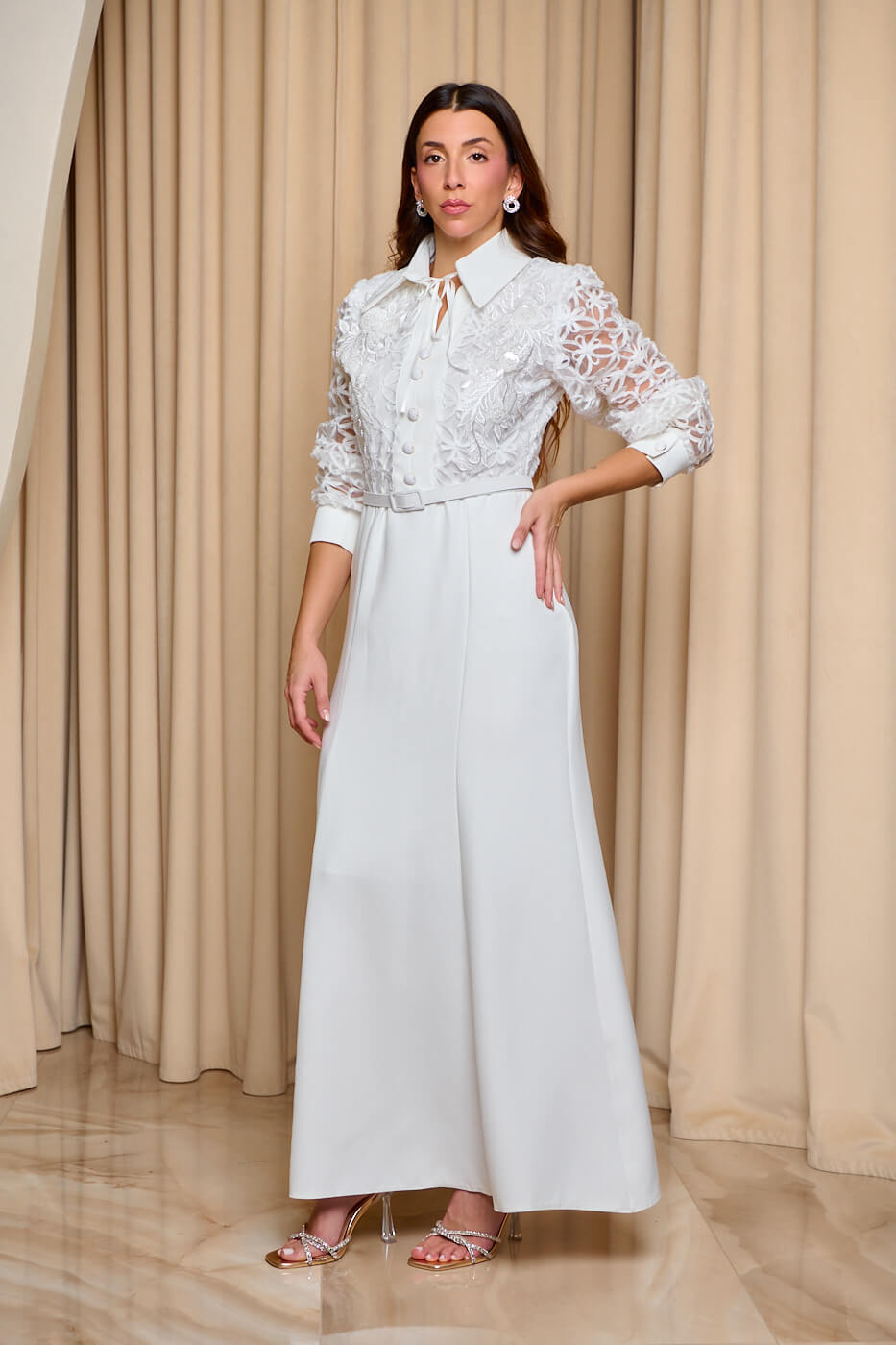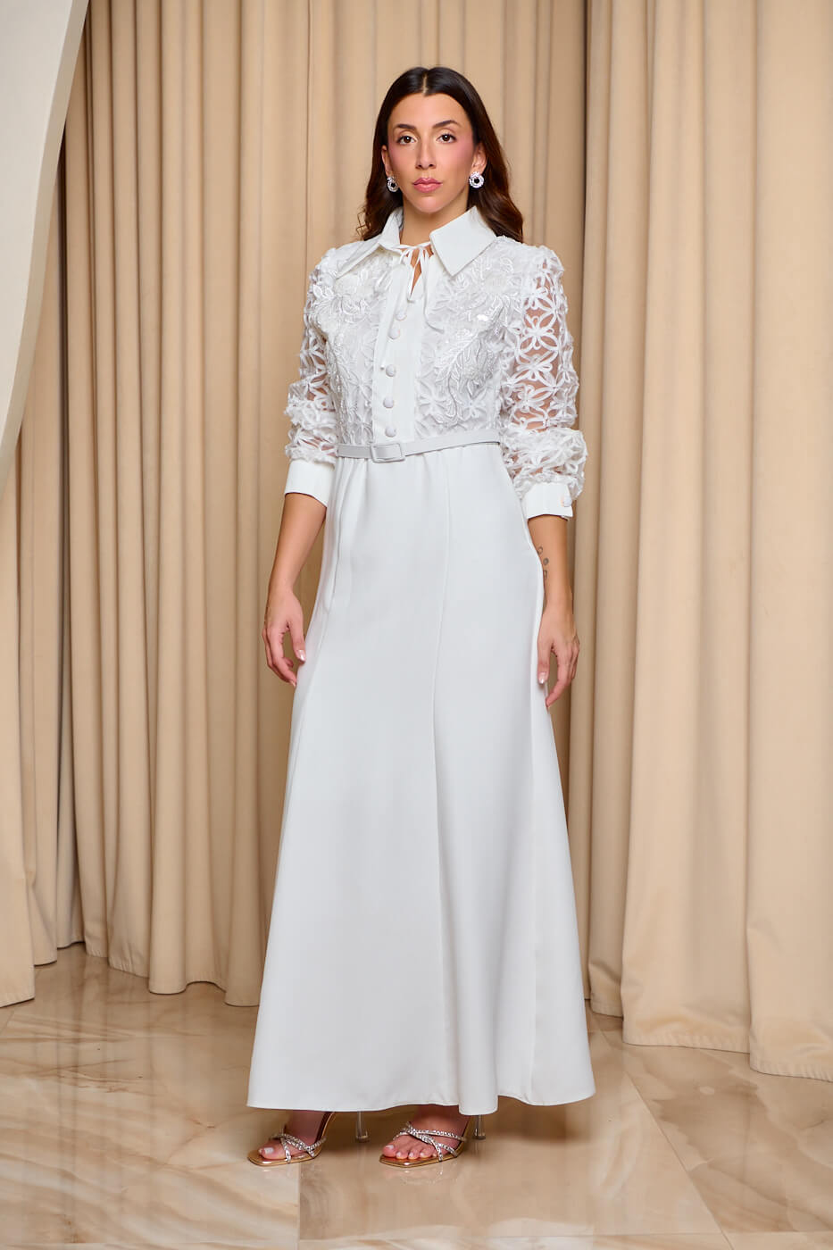 Φόρεμα maxi με ανάγλυφα κεντήματα άσπρο. Ένα κομψό και διαχρονικό φόρεμα σε λευκή απόχρωση. Το επάνω μέρος έχει λευκή δαντέλα σε floral μοτίβο και ανάγλυφα κεντήματα. Διαθέτει κλασικό γιακά με κορδέλα και διακοσμητικά κουμπιά. Τα μανίκια είναι διάφανα και καταλήγουν σε λευκές μανσέτες με διακοσμητικό κουμπί. Το κάτω μέρος είναι σε ίσια γραμμή και διαθέτει εσωτερική φόδρα. Κλείνει με φερμουάρ στο πλάι και έχει δική του αποσπώμενη ζώνη. Ιδανικό για κομψές επίσημες εμφανίσεις.