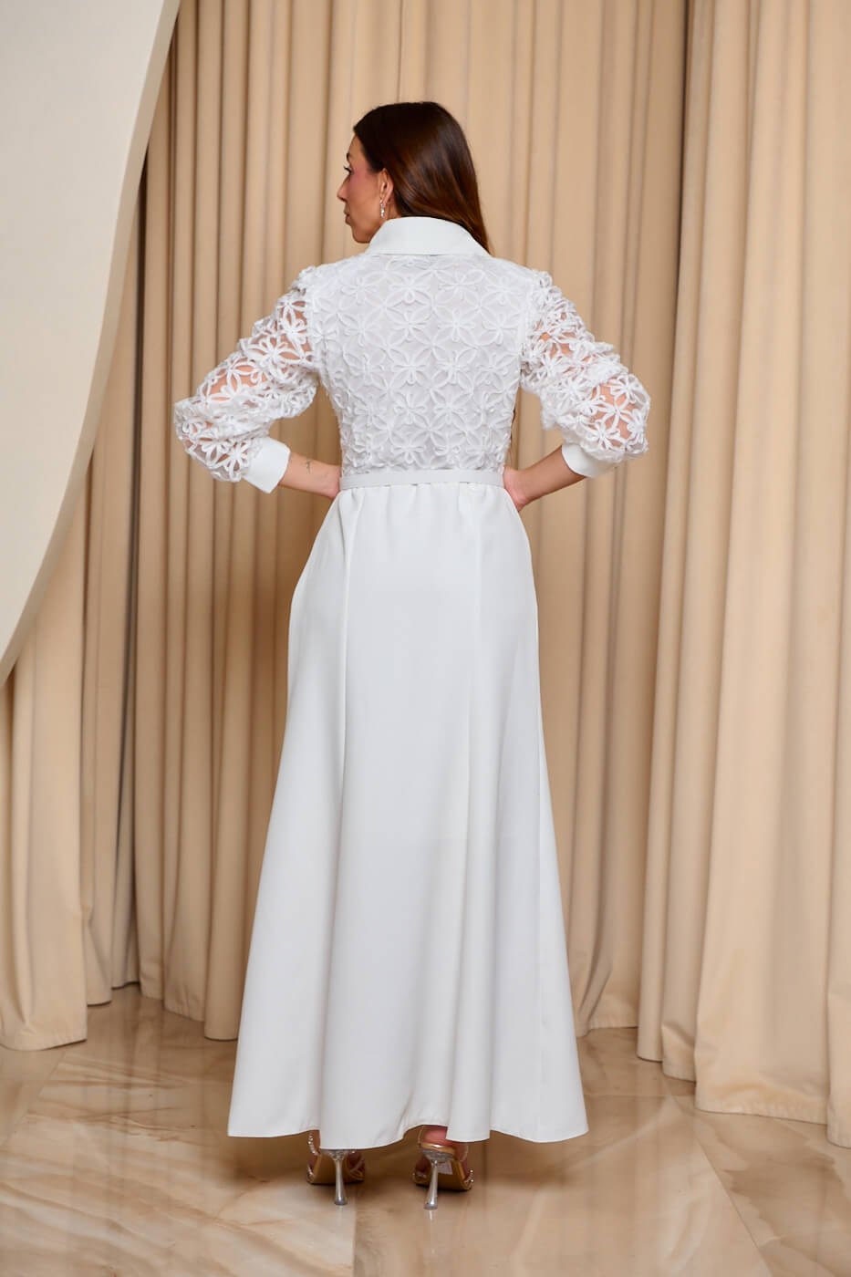 Φόρεμα maxi με ανάγλυφα κεντήματα άσπρο. ο επάνω μέρος έχει λευκή δαντέλα σε floral μοτίβο και ανάγλυφα κεντήματα. Διαθέτει κλασικό γιακά με κορδέλα και διακοσμητικά κουμπιά. Τα μανίκια είναι διάφανα και καταλήγουν σε λευκές μανσέτες με διακοσμητικό κουμπί. Το κάτω μέρος είναι σε ίσια γραμμή και διαθέτει εσωτερική φόδρα. Κλείνει με φερμουάρ στο πλάι.