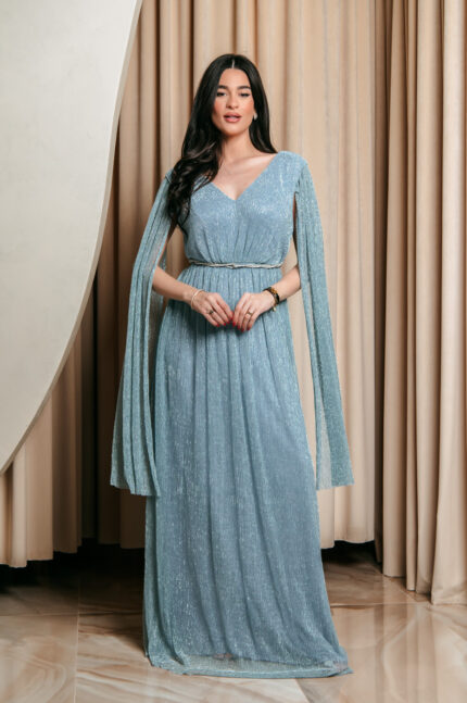 Φόρεμα maxi με δαντέλα και V ντεκολτέ πετρόλ. Το επάνω του μέρος είναι από δαντέλα με floral μοτίβο και διακριτικές πούλιες που προσθέτουν λάμψη. Έχει V ντεκολτέ και κοντά αέρινα μανίκια. Η μέση τονίζεται με μια λεπτή ζώνη από το ίδιο ύφασμα διακοσμημένη με φιόγκο. πλαϊνές πιέτες για κίνηση.