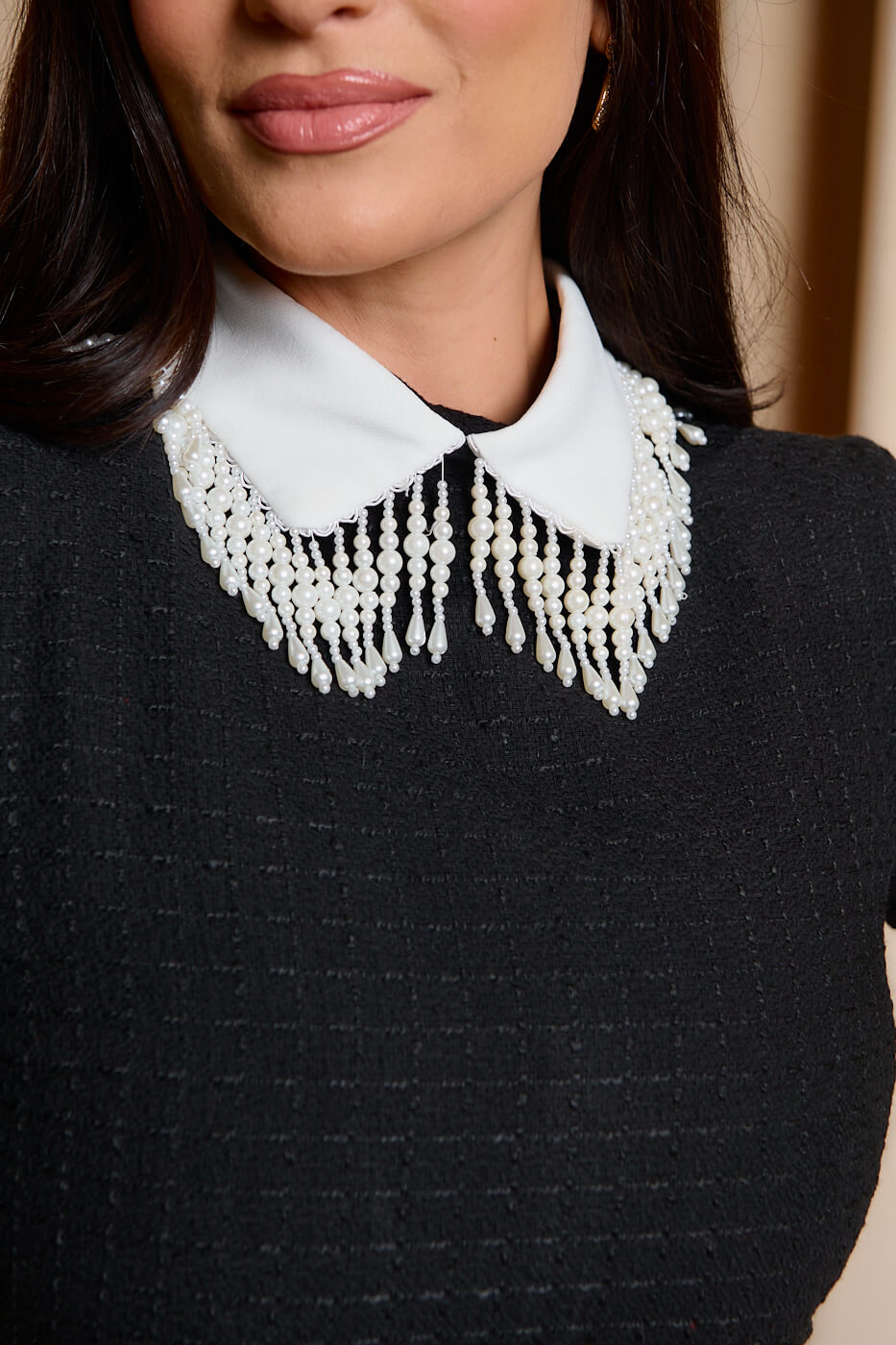 Φόρεμα maxi tweed με διακοσμημένο γιακά μαύρο. Διαθέτει διακοσμημένο γιακά με κρεμαστές πέρλες. Τα μανίκια καταλήγουν σε λευκές μανσέτες με διακοσμητικό κουμπί. Στο κάτω μέρος δημιουργεί μια εντυπωσιακή αντίθεση με άνοιγμα που αποκαλύπτει μια λευκή πλισέ εσωτερική φούστα. Διαθέτει εσωτερική φόδρα, δική του αποσπώμενη ζώνη και κλείνει με φερμουάρ πίσω.