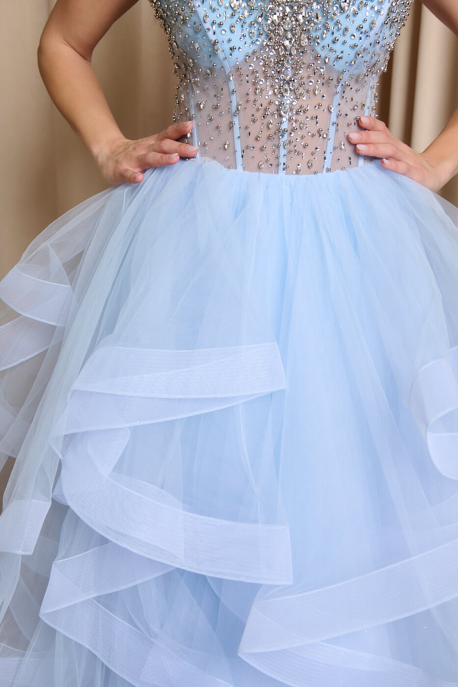 Φόρεμα maxi με διακοσμημένο μπούστο και βολάν baby blue. Ένα άκρως εντυπωσιακό maxi φόρεμα στην απόλυτη baby blue απόχρωση. Το πάνω μέρος είναι τύπου κορσέ ημιδιάφανο με διακόσμηση από πέτρες και στρας που χαρίζουν εκθαμβωτική λάμψη. Διαθέτει μπανέλες, εσωτερικά cups και αποσπώμενες τιράντες. Το εντυπωσιακό κάτω μέρος είναι πολυεπίπεδο με διαδοχικά βολάν από τούλι που δημιουργούν πλούσιο όγκο και μοναδική κίνηση σε κάθε βήμα. Έχει εσωτερική φόδρα και κλείνει με φερμουάρ πίσω. Η γραμμή του αγκαλιάζει τη μέση και ανοίγει σε μια παραμυθένια, princess αισθητική. Διαθέτει διακόσμηση από στρας και πέρλες σε όλο του το μήκος. Ένα φόρεμα που έχει σχεδιαστεί για να κάνει κάθε γυναίκα που το φοράει να νιώθει λες και βγήκε από παραμύθι.