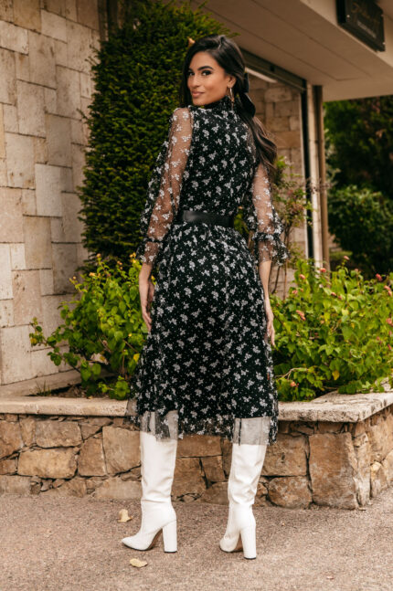 Διαθέτει λαμπερές πέτρες στο λαιμό και γύρω από το μπούστο. Στο πάνω μέρος έχει V ντεκολτέ  και φαρδιές τιράντες ενώ έχει και εντυπωσιακή ημιδιάφανη ενσωματωμένη μπέρτα. Το κάτω μέρος είναι σε ίσια γραμμή. Έχει εσωτερική φόδρα και cups στο μπούστο. Κλείνει με φερμουάρ πίσω.