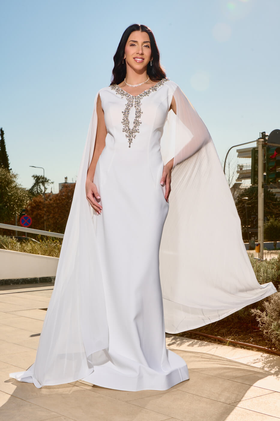 Φόρεμα maxi με διακοσμητικές πέτρες και μπέρτα άσπρο . Εντυπωσιακό maxi φόρεμα στην πιο διαχρονική και κομψή λευκή απόχρωση. Διαθέτει λαμπερές πέτρες στο λαιμό και γύρω από το μπούστο. Στο πάνω μέρος έχει V ντεκολτέ  και φαρδιές τιράντες ενώ έχει και εντυπωσιακή ημιδιάφανη ενσωματωμένη μπέρτα. Το κάτω μέρος είναι σε ίσια γραμμή. Έχει εσωτερική φόδρα και cups στο μπούστο. Κλείνει με φερμουάρ πίσω.  Ιδανικό για λαμπερές επίσημες εμφανίσεις που ξεχωρίζουν για την κομψότητα τους. Κατάλληλο και για νυφικό φόρεμα.
