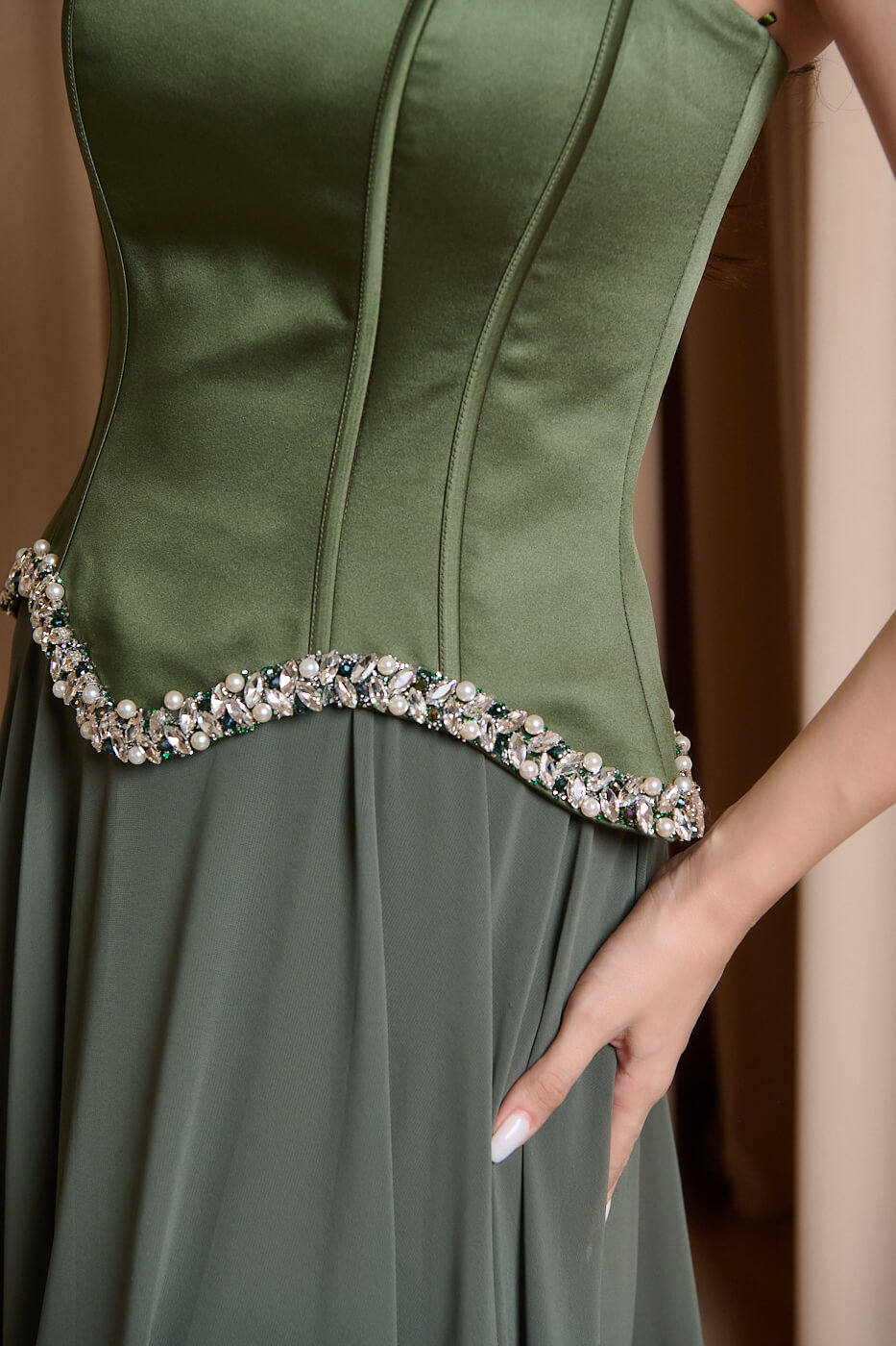 Φόρεμα maxi με ενσωματωμένο σατέν κορσέ και πέρλες olive