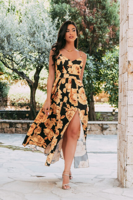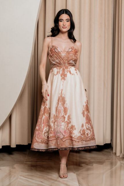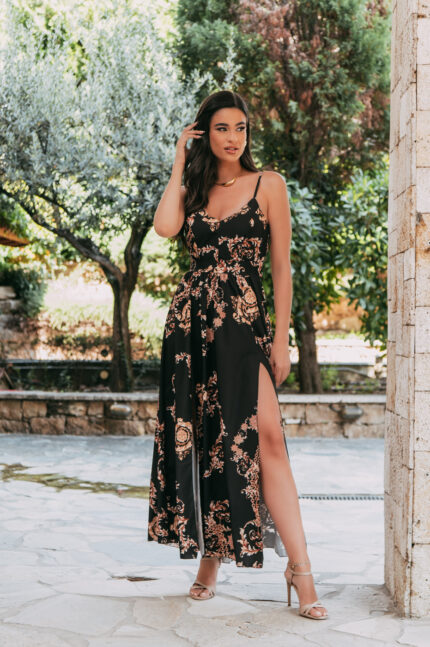 Φόρεμα maxi με επίπεδα και πλεκτές λεπτομέρειες καφέ. Διαθέτει σφηκοφωλιά πίσω για ελαστικότητα. Εσωτερική φόδρα και χοντρές τιράντες. Πλεκτή λεπτομέρεια στο μπούστο και στις τιράντες μπροστά.