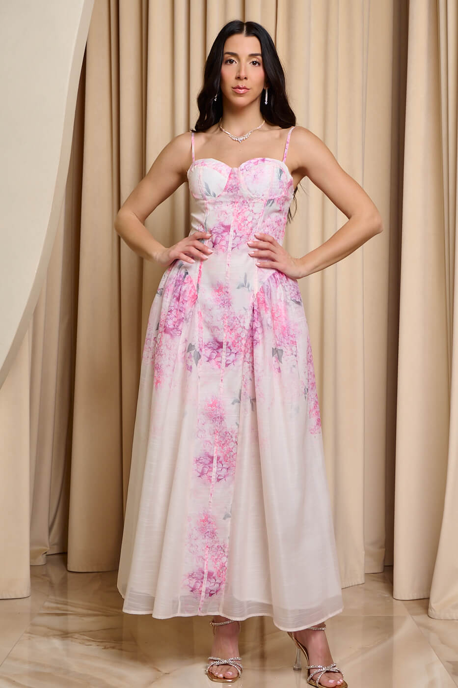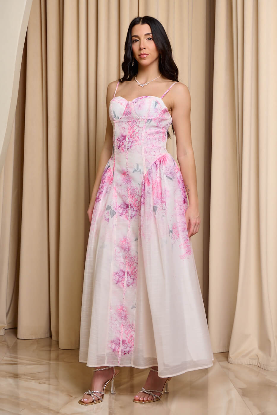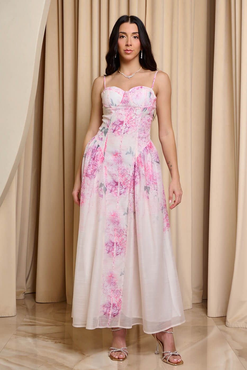 Φόρεμα maxi με floral μοτίβο ροζ . Ένα αέρινο και ρομαντικό φόρεμα σε απαλού εκρού τόνο με ροζ floral μοτίβο. Το πάνω μέρος έχει εφέ κορσέ που αναδεικνύει τη σιλουέτα. Έχει ραφές και εσωτερικά cups για καλύτερη στήριξη. Διαθέτει ρυθμιζόμενες τιράντες και σφηκοφωλιά πίσω. Το κάτω μέρος είναι αέρινο με πιέτες στο πλάι και ανάλαφρο ύφασμα που χαρίζει κομψή κίνηση σε κάθε βήμα. Έχει εσωτερική φόδρα που προσφέρει κάλυψη. Ιδανικό για κομψές εμφανίσεις με ρομαντική διάθεση και στυλ.