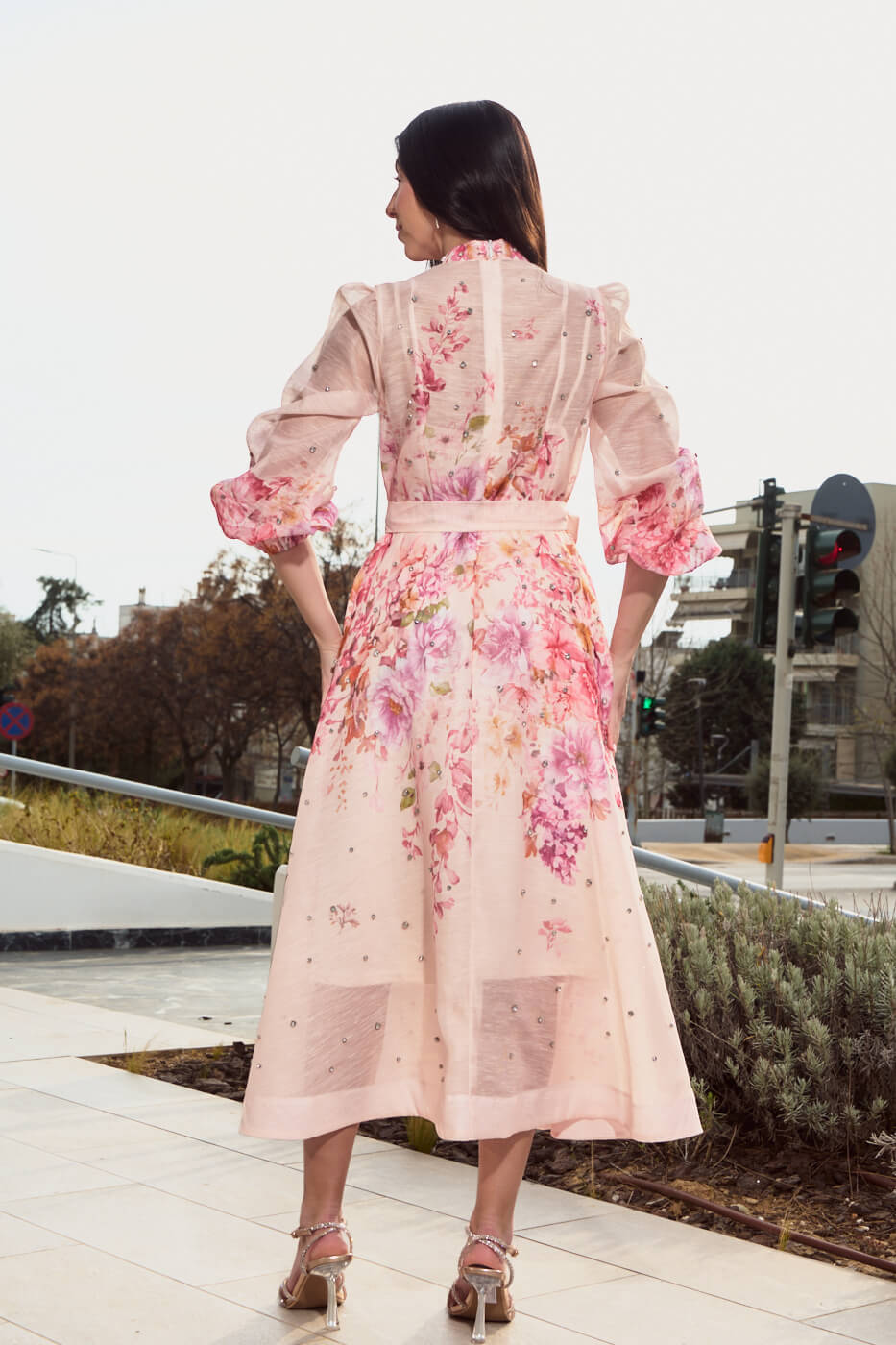 Διαθέτει ψηλή στρογγυλή λαιμόκοψη και ημιδιάφανα μακριά μανίκια με λάστιχο στο τελείωμα. Τα λαμπερά στρας σε όλο του το μήκος καθώς και τα κουμπιά – κόσμημα που διαθέτει δίνουν μια πινελιά πολυτέλειας στο φόρεμα. Έχει δική του ζώνη και αποσπώμενο μεσοφόρι. Κλείνει με φερμουάρ πίσω.