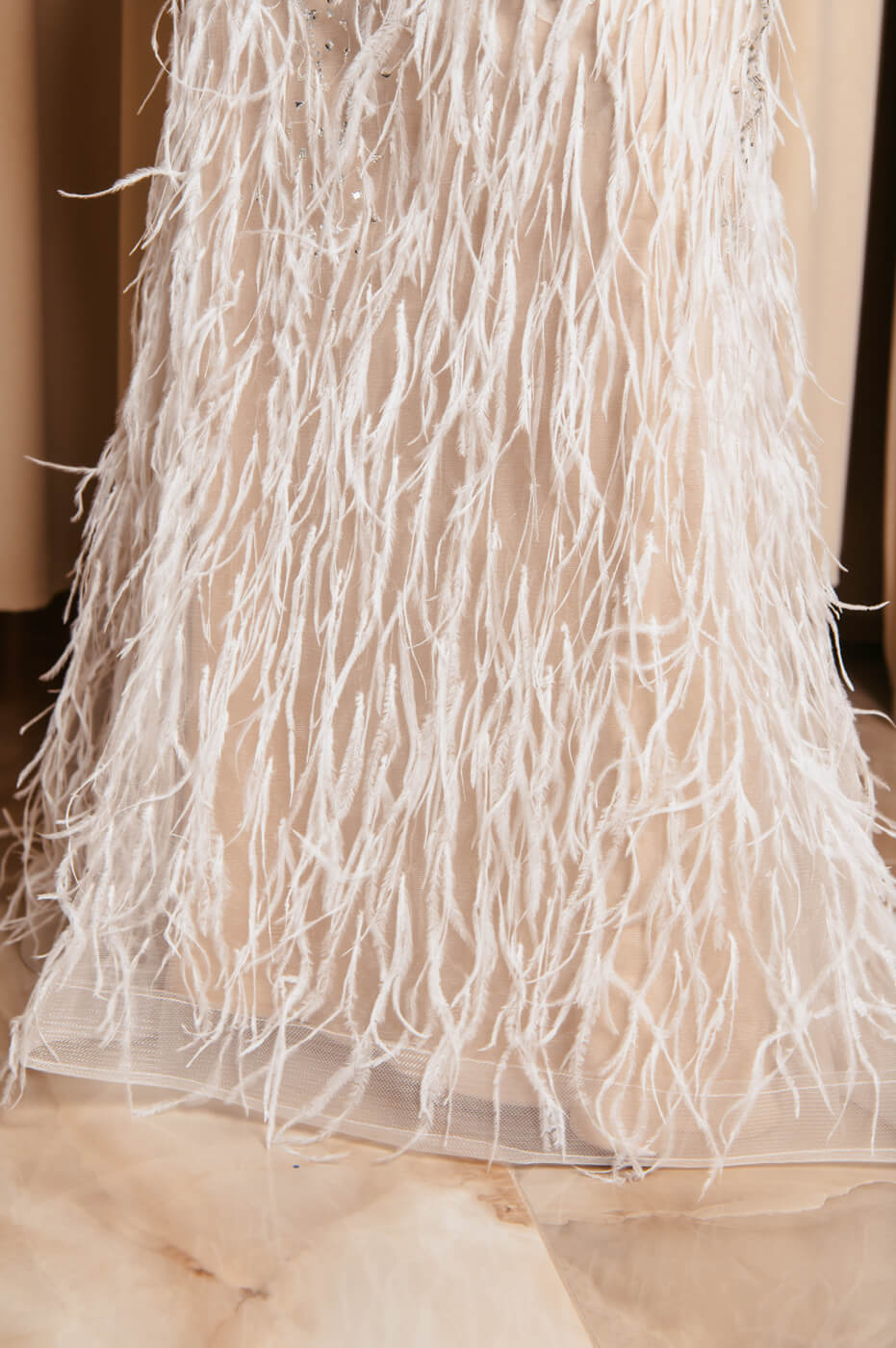 Φόρεμα maxi με κεντημένα στο χέρι στρας και feathers μπεζ. Διακοσμημένο με στρας, διαθέτει ενσωματωμένα cups για σταθερότητα και ανάδειξη του μπούστου. Καλυμμένο με feathers. Είναι ντουμπλαρισμένο με εσωτερική φόδρα και πάνω υπάρχει λεπτή στρώση τούλι. Ανοιχτή πλάτη με φερμουάρ.