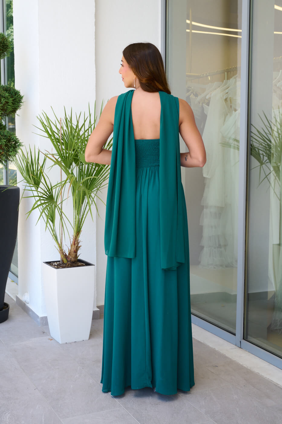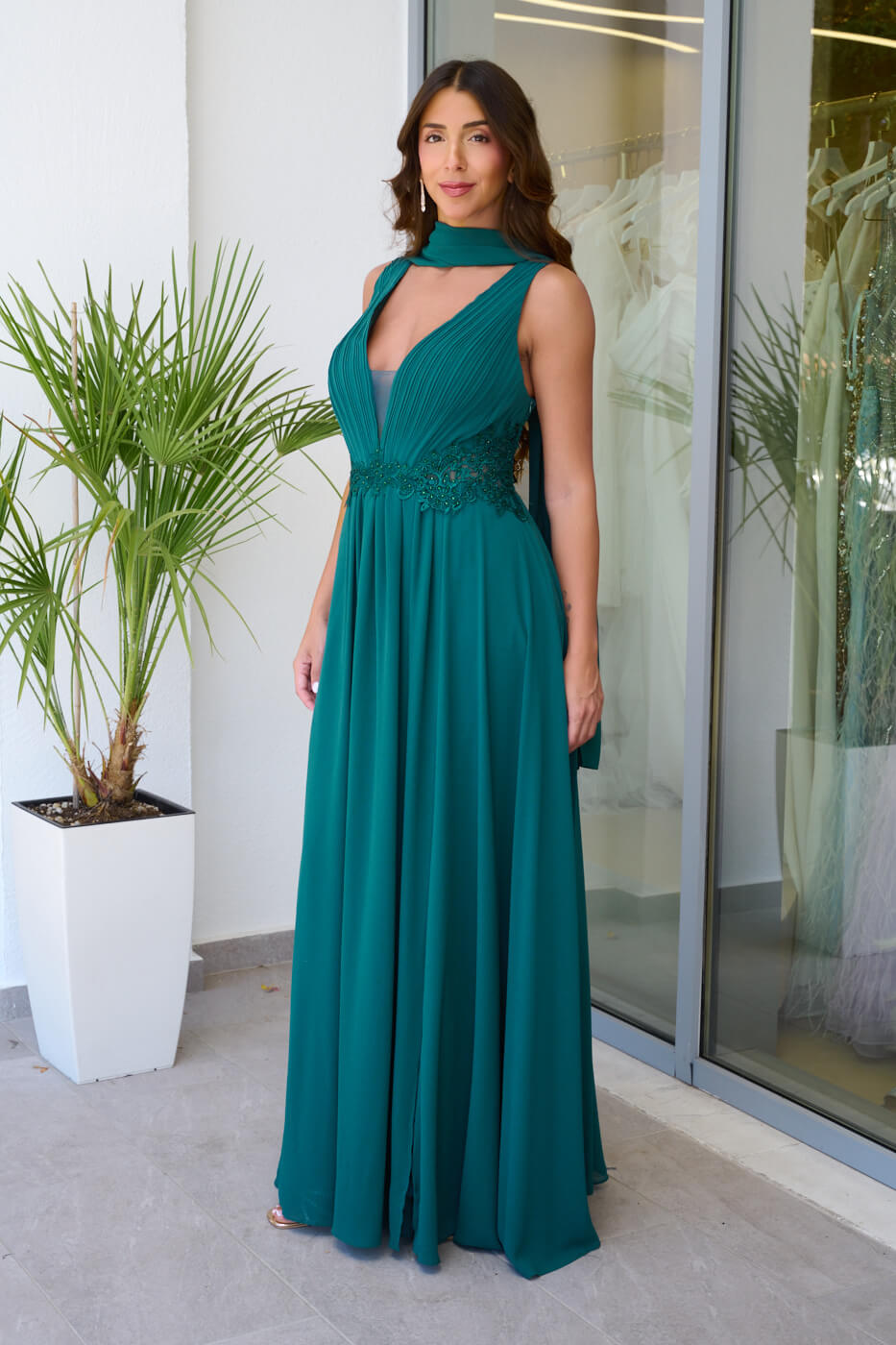 Φόρεμα maxi με κεντημένες λεπτομέρειες και φουλάρι κυπαρισσί. Με χοντρές τιράντες, σχέδιο από πιέτες στο μπούστο και κεντημένες λεπτομέρειες με στρας στην μέση. Διαθέτει διαφάνεια στο μπούστο που δημιουργεί βαθύ V ντεκολτέ, σφηκοφωλιά στο πίσω μέρος, σκίσιμο στο πλάι, cups, εσωτερική φόδρα και φουλάρι από το ίδιο ύφασμα και χρώμα.