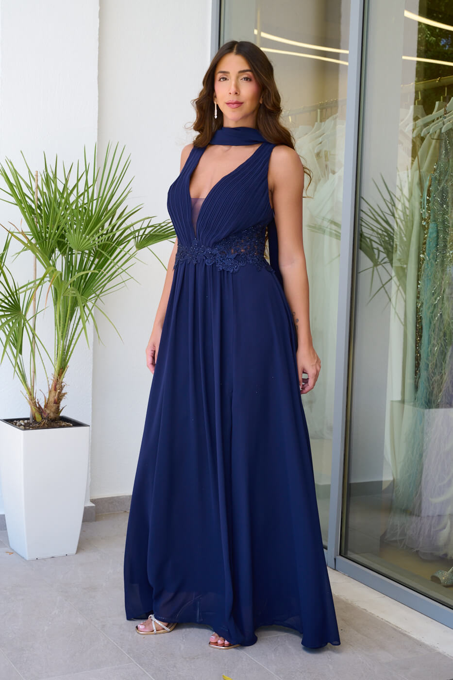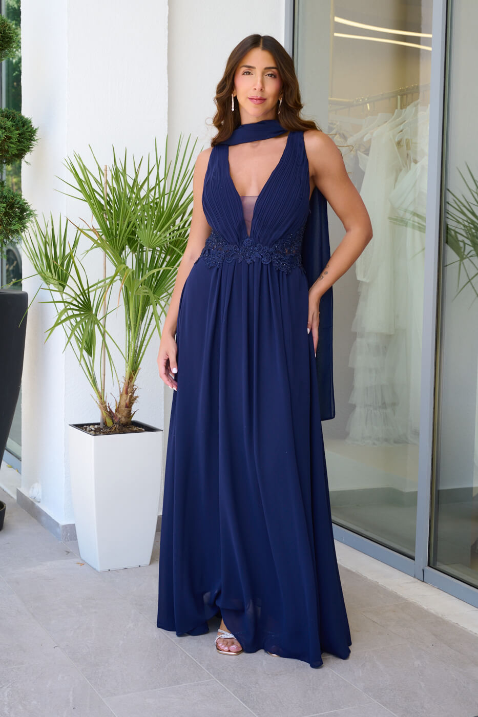 Φόρεμα maxi με κεντημένες λεπτομέρειες και φουλάρι midnight blue. Με χοντρές τιράντες, σχέδιο από πιέτες στο μπούστο και κεντημένες λεπτομέρειες με στρας στην μέση. Διαθέτει διαφάνεια στο μπούστο που δημιουργεί βαθύ V ντεκολτέ, σφηκοφωλιά στο πίσω μέρος, σκίσιμο στο πλάι, cups, εσωτερική φόδρα και φουλάρι από το ίδιο ύφασμα και χρώμα.